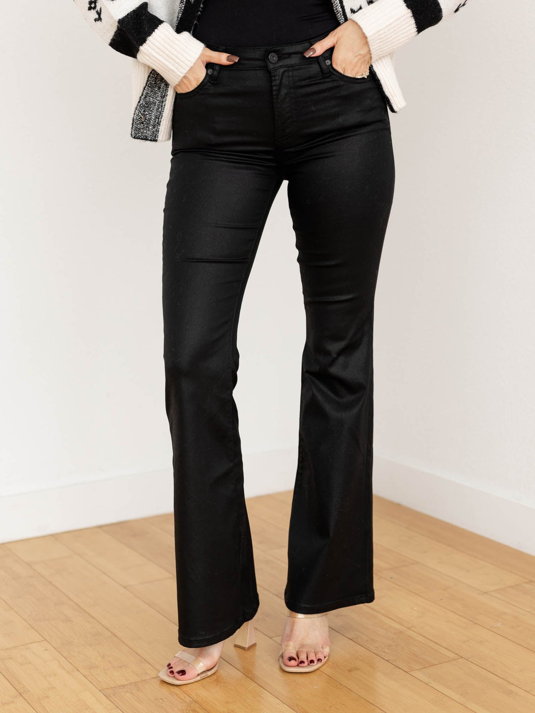 Elevate your night-out game with this chic black flare. The coated fabrication gives it that polished, dressier edge—perfect for transitioning from day to evening without missing a beat. With a mid-rise fit and flared silhouette, it's got the retro-cool factor that pairs effortlessly with heels and a top for an instant sophisticated look. The longer 33" inseam keeps things sleek and elongated. One piece, endless styling possibilities.