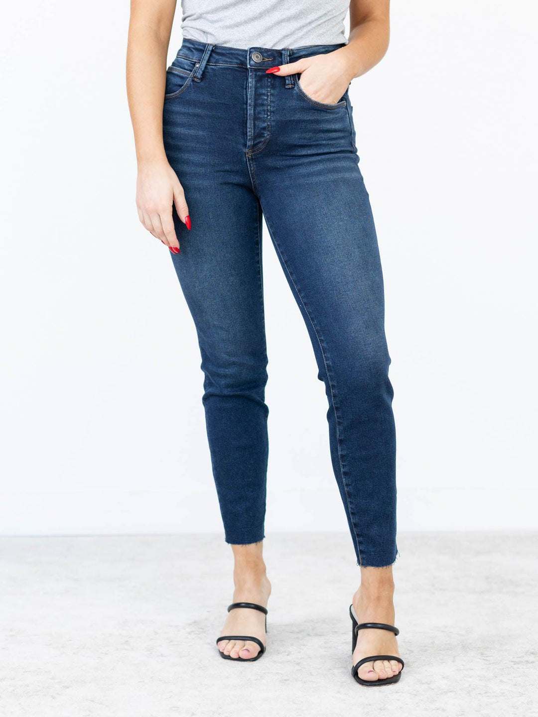 A hidden button fly leads down from a high rise design to add an elongated look and feel to these new arrivals from KUT. A high rise design leads into a slimmer straight leg design, complete with a raw hemline to add a slightly casual feel while the darker wash tends to lend itself to a more dressy feel. A great versatile denim to add into your wardrobe, these are a MUST in our book!