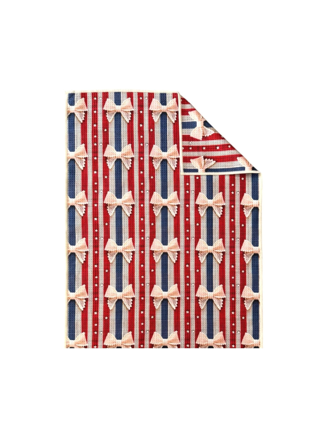 Americana inspired with a feminine twist, this striped hand towel features a repeating bow pattern for a fun and playful summer style.