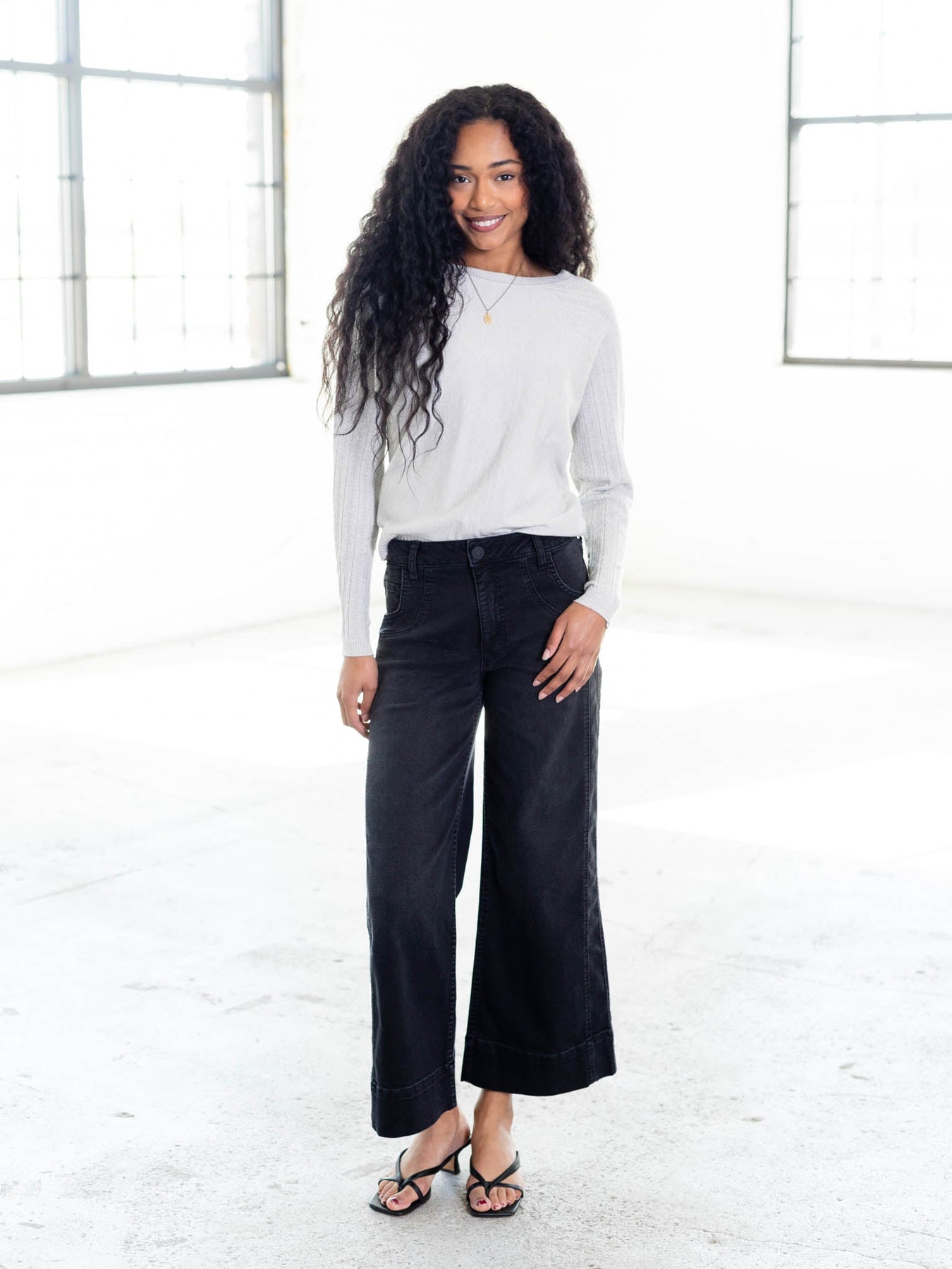 French Vanilla color has been styled with KUT Ablaze Jean High Rise Wide Leg