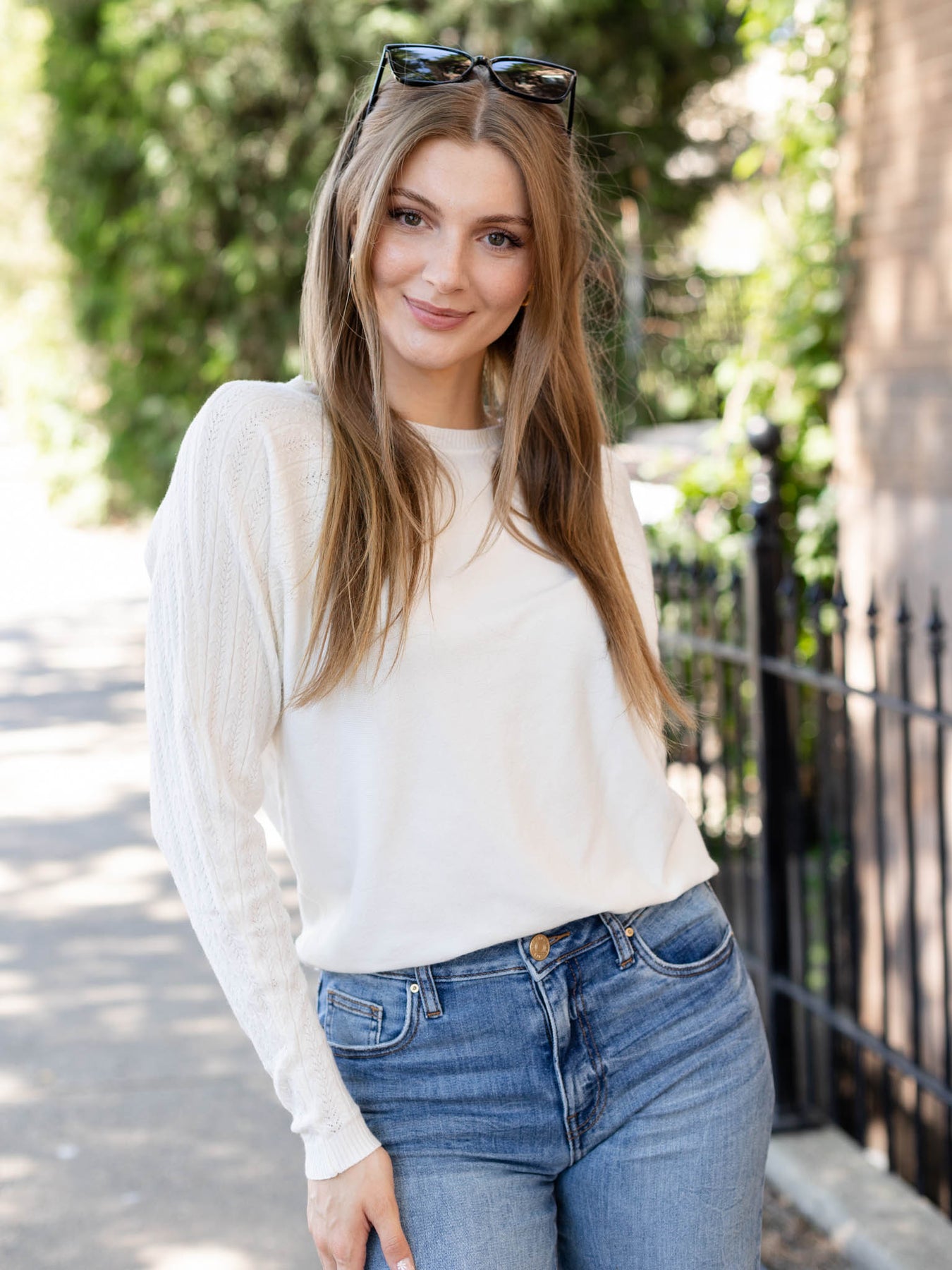 Elevate your fall style game with this sweater from Allie Rose. This soft, lightweight knit top features charming braided pointelle details on the sleeves and a rounded open neckline that invites a little flirty flair. Designed with a feminine fit, it hugs just right for effortless style and comfort—perfect for day-to-night adventures with a playful twist.