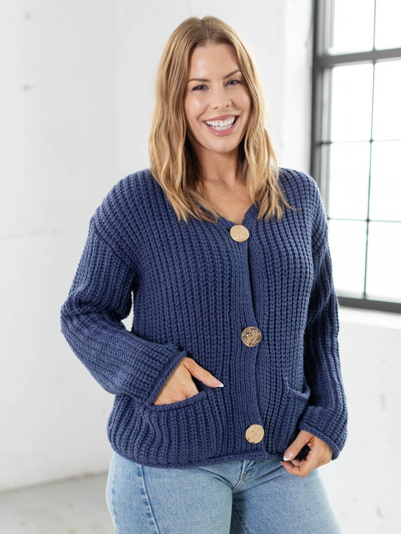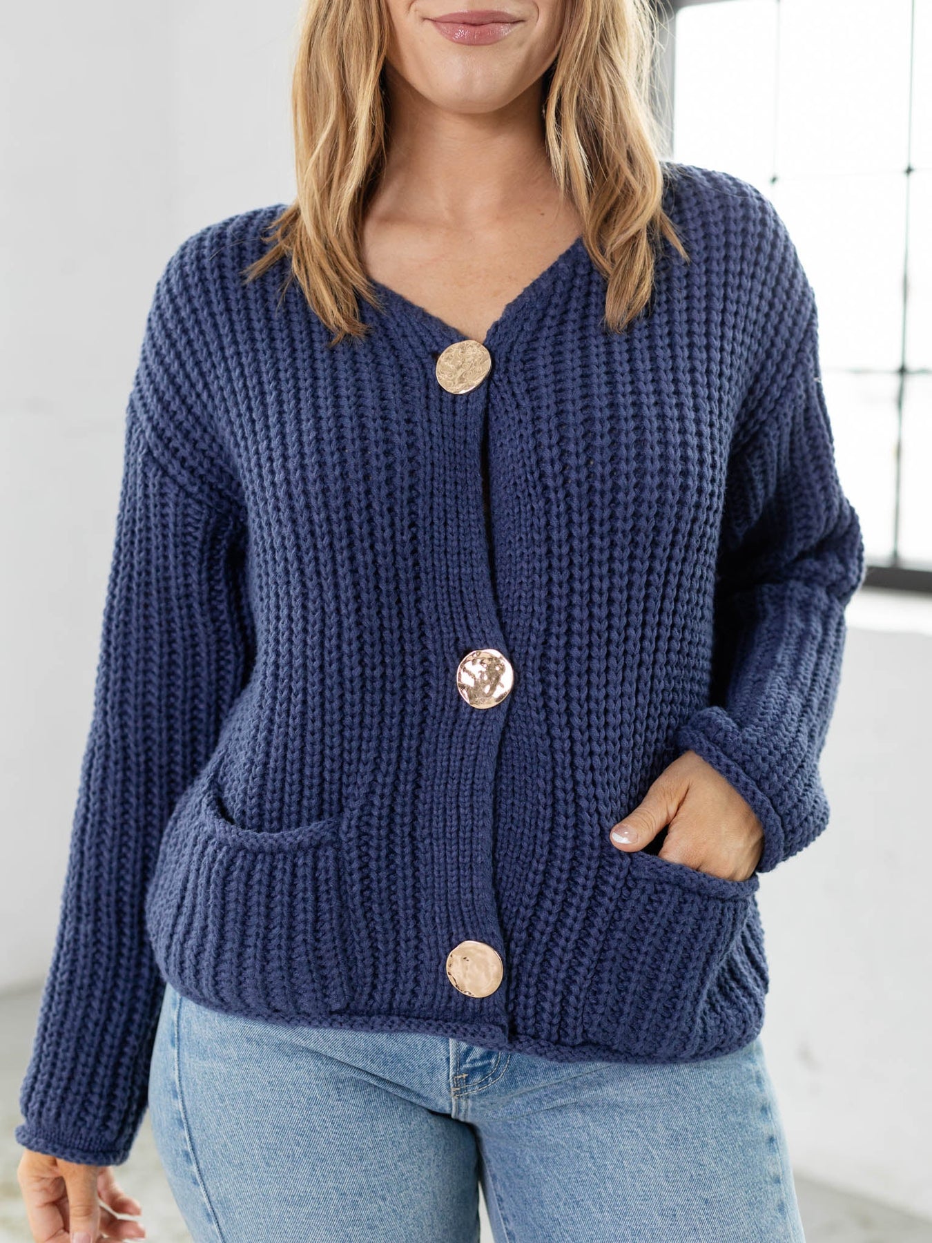 Cozy up in style with this chunky sweater top, featuring eye-catching gold statement buttons that add instant glamour to your everyday look. Practical front pockets keep your essentials close while you stay warm and comfortable. Perfect for layering or wearing solo, this piece brings both function and flair to your wardrobe rotation.