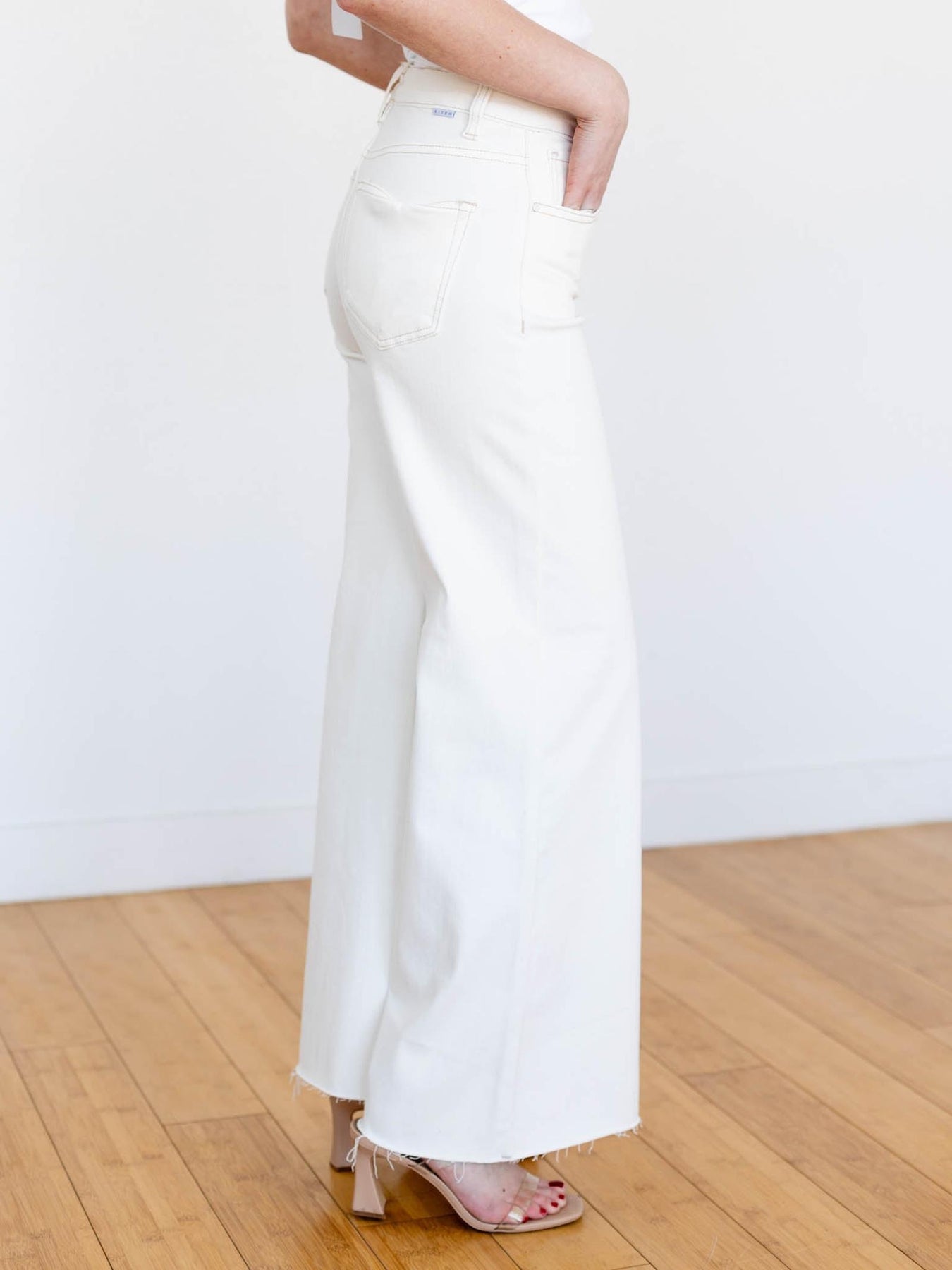 Elevate your denim game with this cream-colored palazzo that's as comfortable as it is chic. High-rise cut with built-in tummy control keeps you feeling confident all day, while the wide-leg silhouette flows effortlessly from desk to dinner. Contrasting tan stitching adds a subtle design detail, and creamy white hardware completes the polished look. Pair with anything from sneakers to heels—this