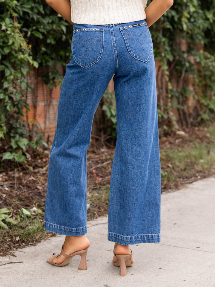 These jeans from Rollas bring a playful edge to your wardrobe with their flared wide-leg cut and high-rise fit. Featuring a classic medium blue wash, stud details scattered throughout, and a front patch pocket, they combine cool style with a touch of rebellious charm. Perfect for making a statement while staying effortlessly comfortable.