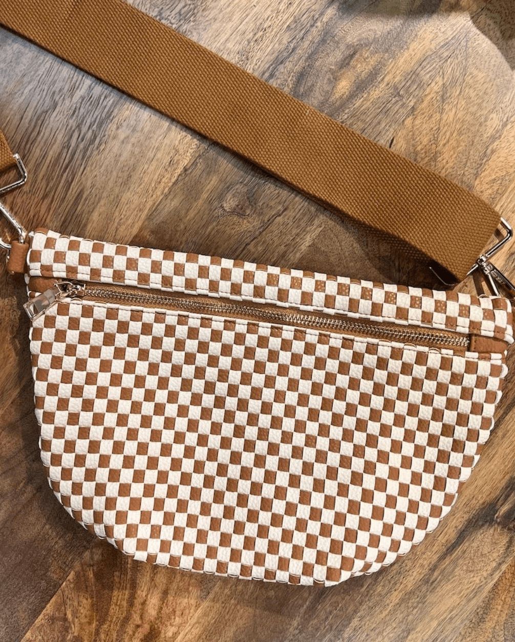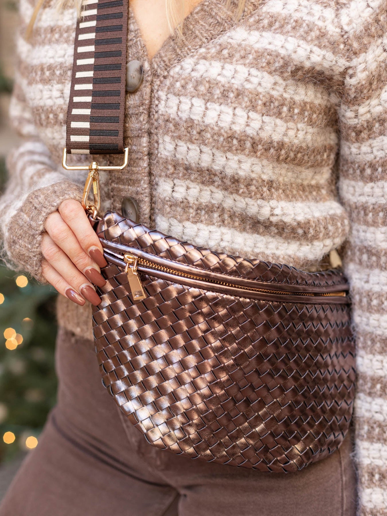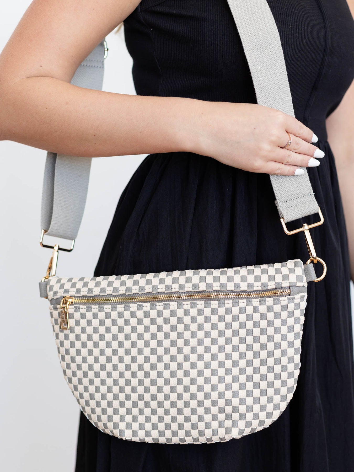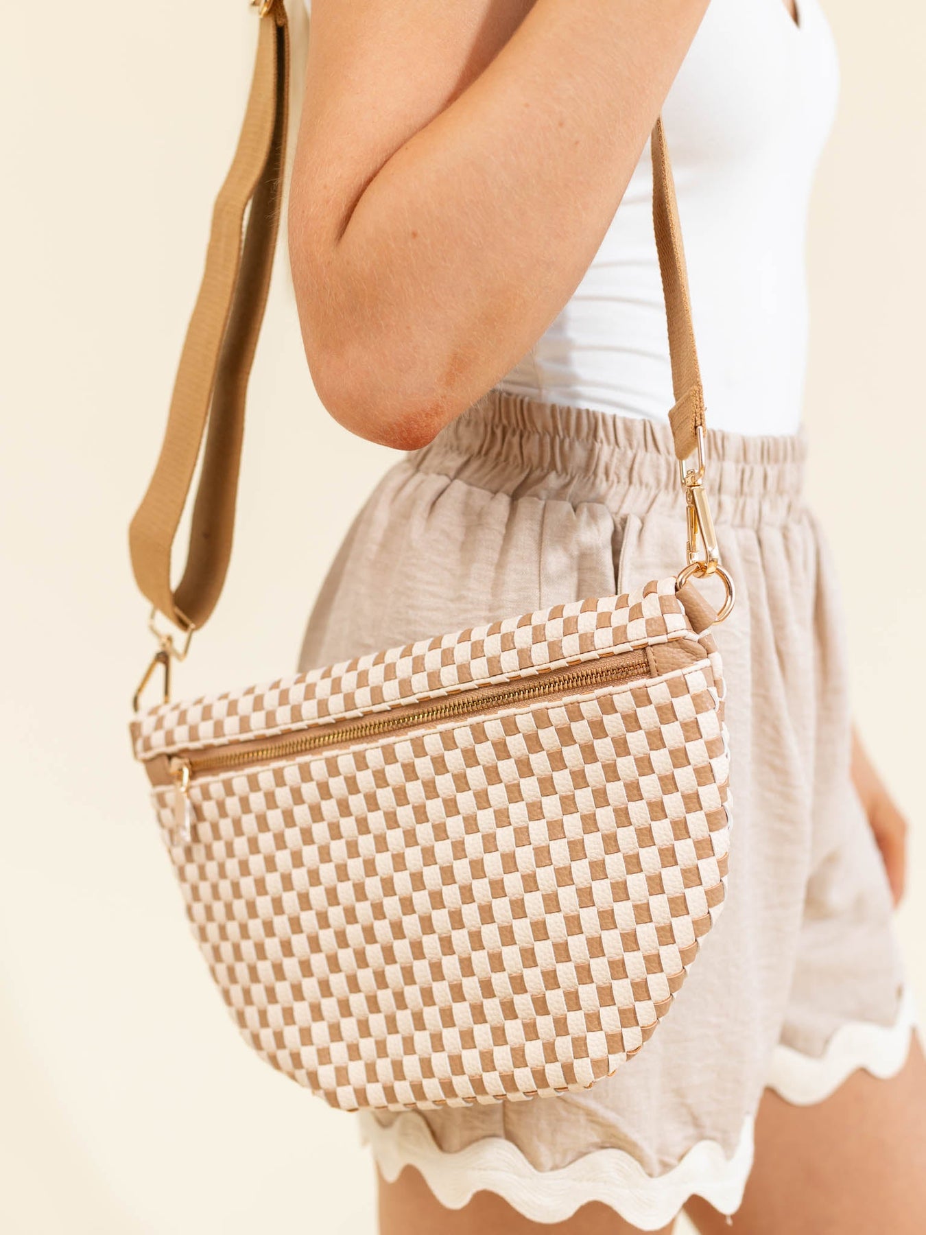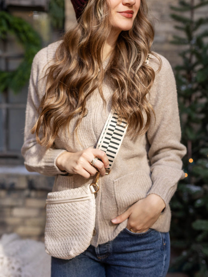 This adorable woven bum bag sits sleek across like a crossbody for a casual look to hold all of your necessities. We love the wide, adjustable strap to allow this look to be a versatile addition to your everyday outfit.