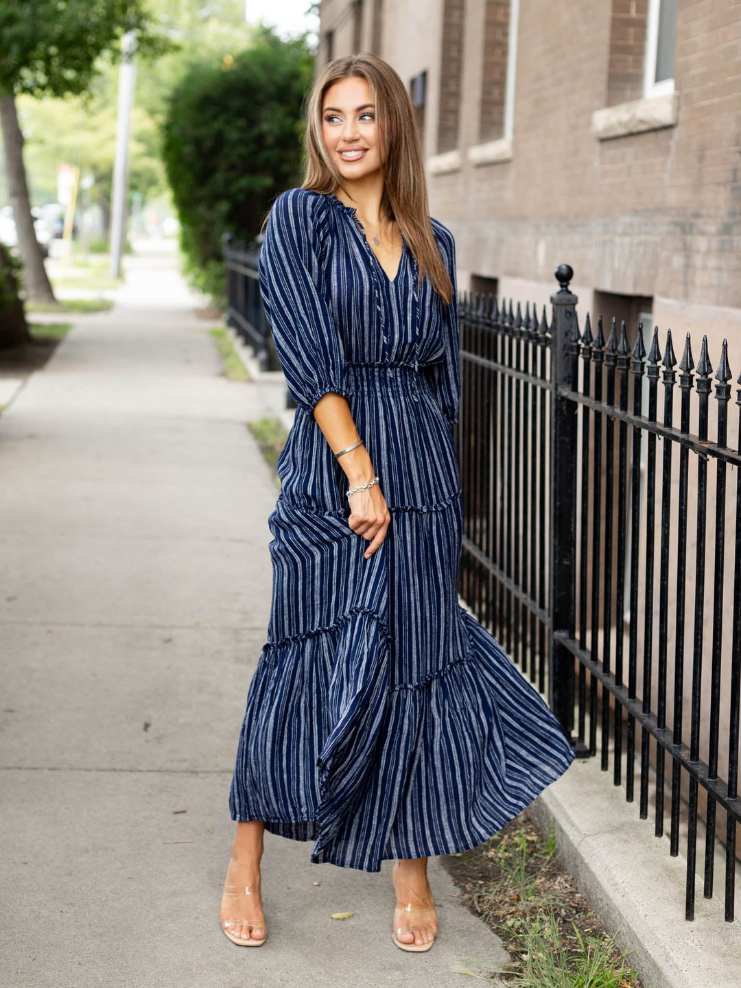 Embrace effortless charm with this showstopper from Rails. Featuring a playful stripe pattern and subtle puffed mid-length sleeves, this dress offers a flowy tiered silhouette that moves with you. The smocked gathered waist adds a flattering shape, while the tie neck accent brings a whimsical, boho-inspired touch perfect for sunny days and casual outings.