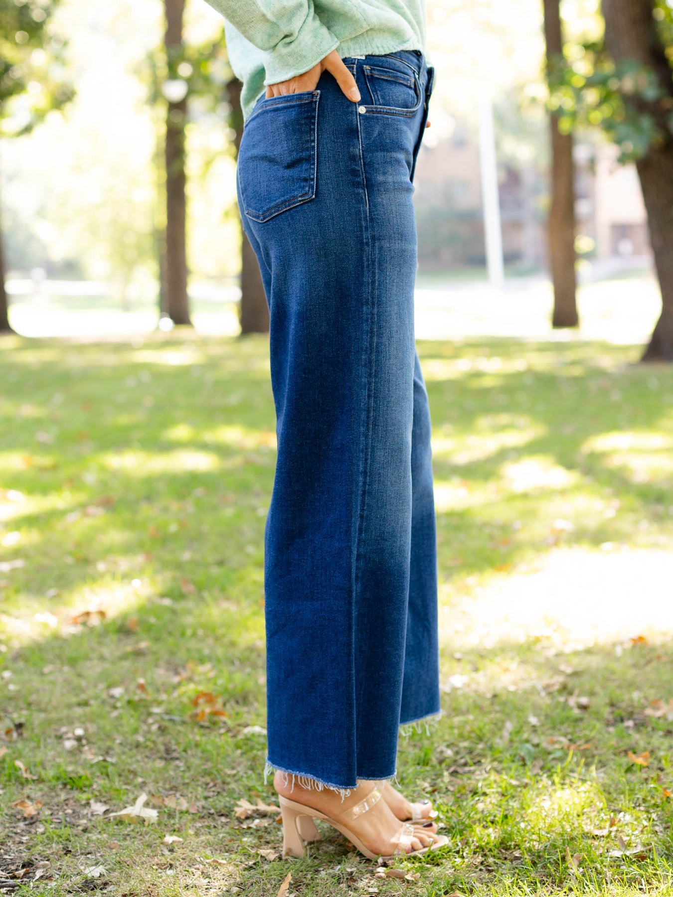 The Citizens of Humanity Augusta Lyra Wide Leg Crop features a sophisticated, slightly darker wash perfect for fall and winter. Designed with a wide leg silhouette and a slightly shorter length, this denim offers a modern, raw hemline detail. It's an effortless yet polished choice, blending casual comfort with a refined edge for your seasonal wardrobe.