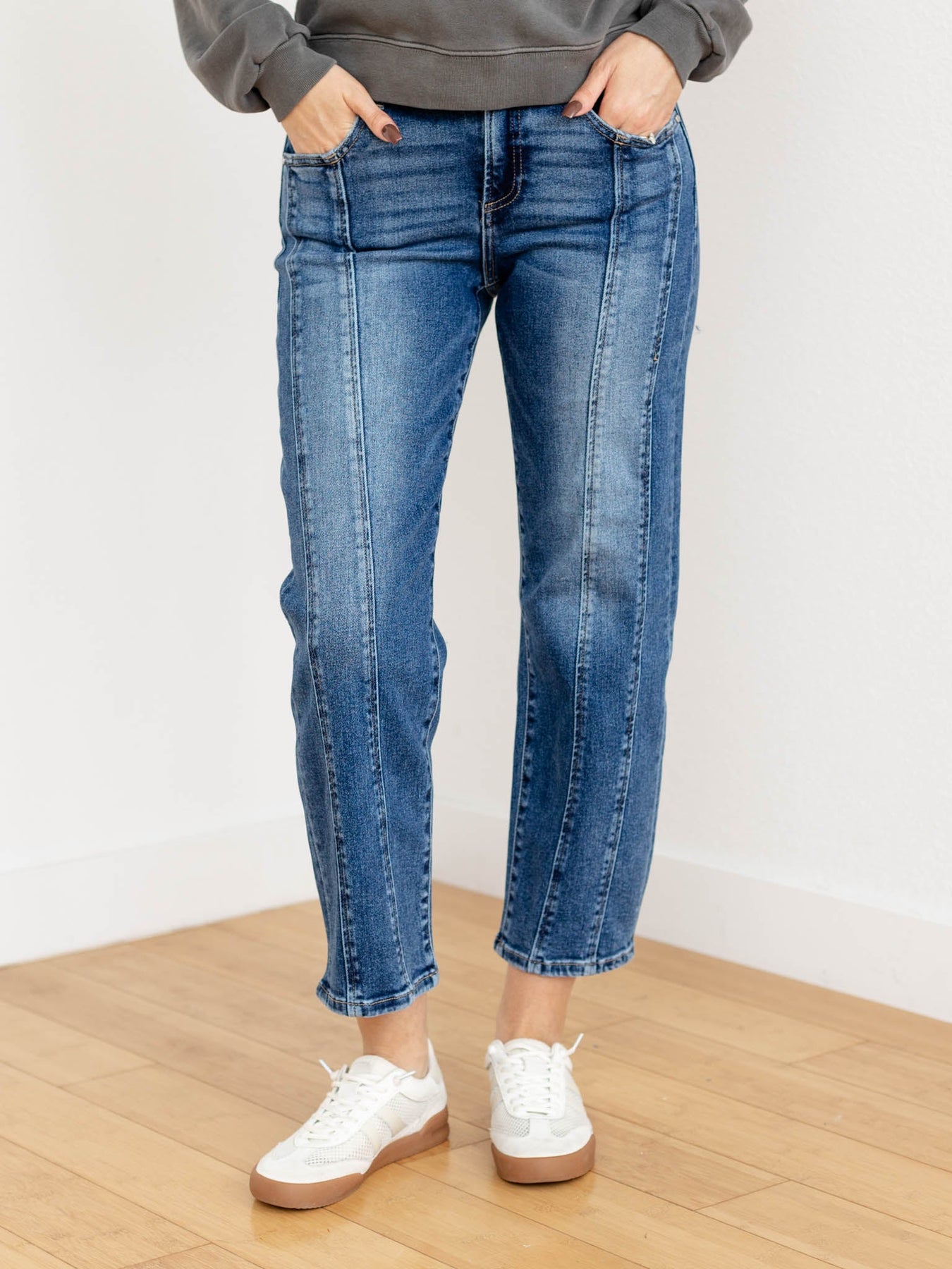 These RISEN jeans bring effortless cool to your everyday rotation. Crafted in a washed medium tone, they feature a flattering high rise with a cropped ankle length that hits just right. The straight leg silhouette keeps things classic, while front seam detailing adds a subtle edge that catches the light. Versatile enough for casual days and polished enough for nights out—slip them on and feel the difference quality denim makes.