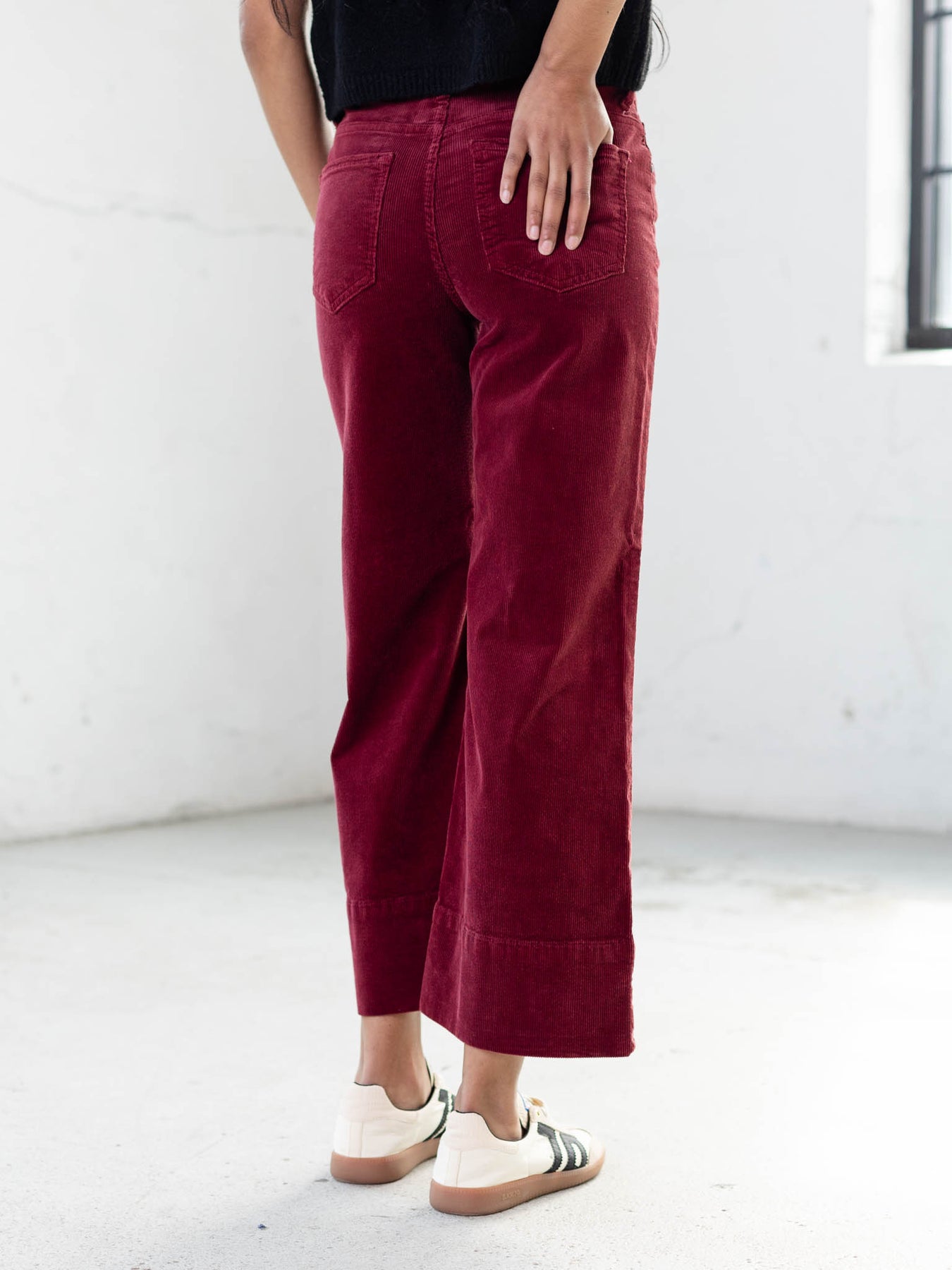 Discover the RISEN Wine High Rise Crop Wide Cord, featuring a cozy corduroy texture perfect for fall. Its rich jewel-toned wine color adds warmth and depth to your wardrobe. Designed with a wider leg silhouette and a shorter length, this piece offers a playful and stylish twist on classic pants. Embrace fun, comfort, and effortless cool in every step.