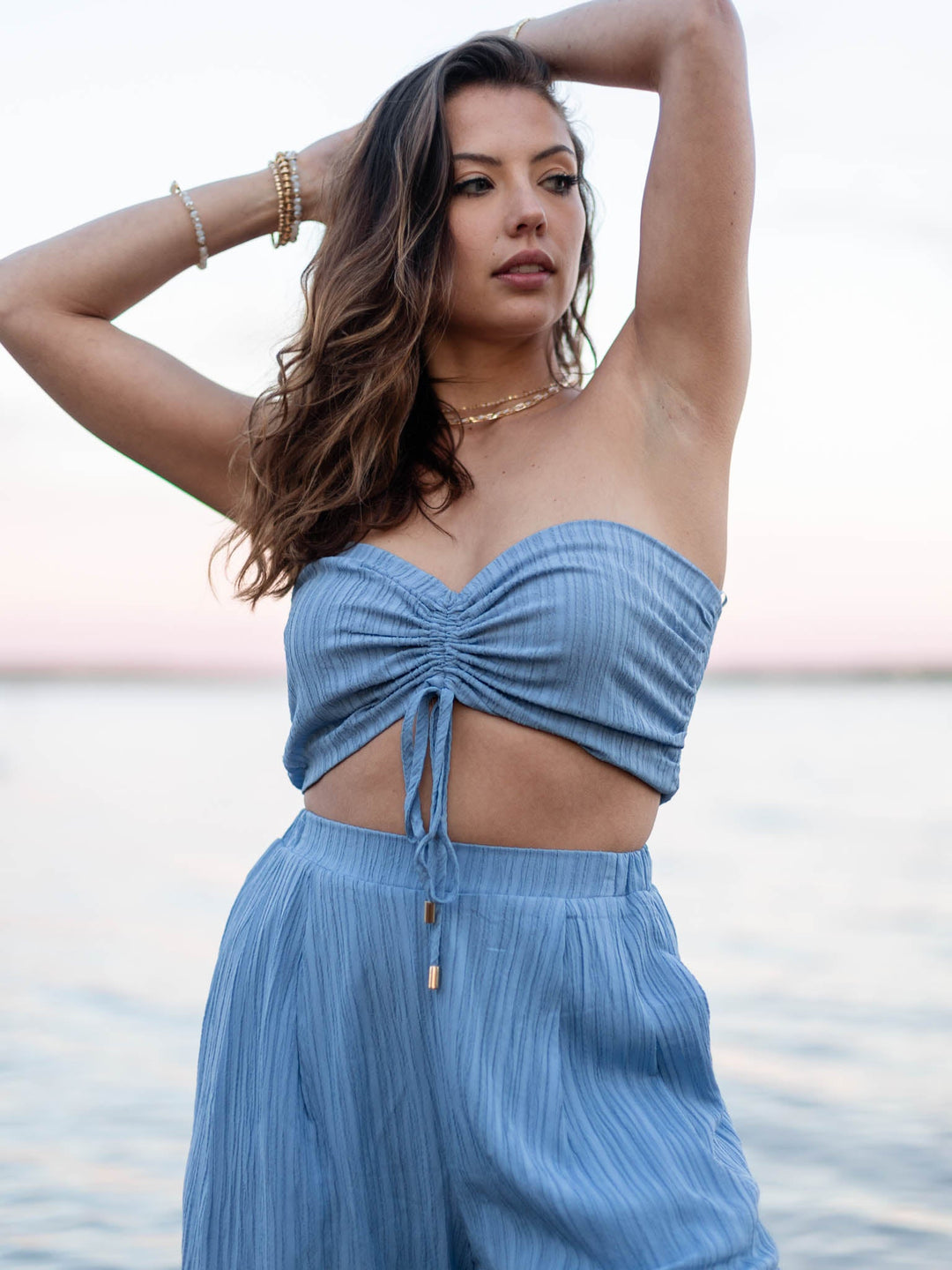 Inspired by the classic bandeau style, the Allie Rose Textured Cinch Bandeau Top adds a touch of texture with its ruched center and striped detail. Ultra cropped for a modern look, this top can be perfectly matched with its bottoms for a complete and stylish outfit.