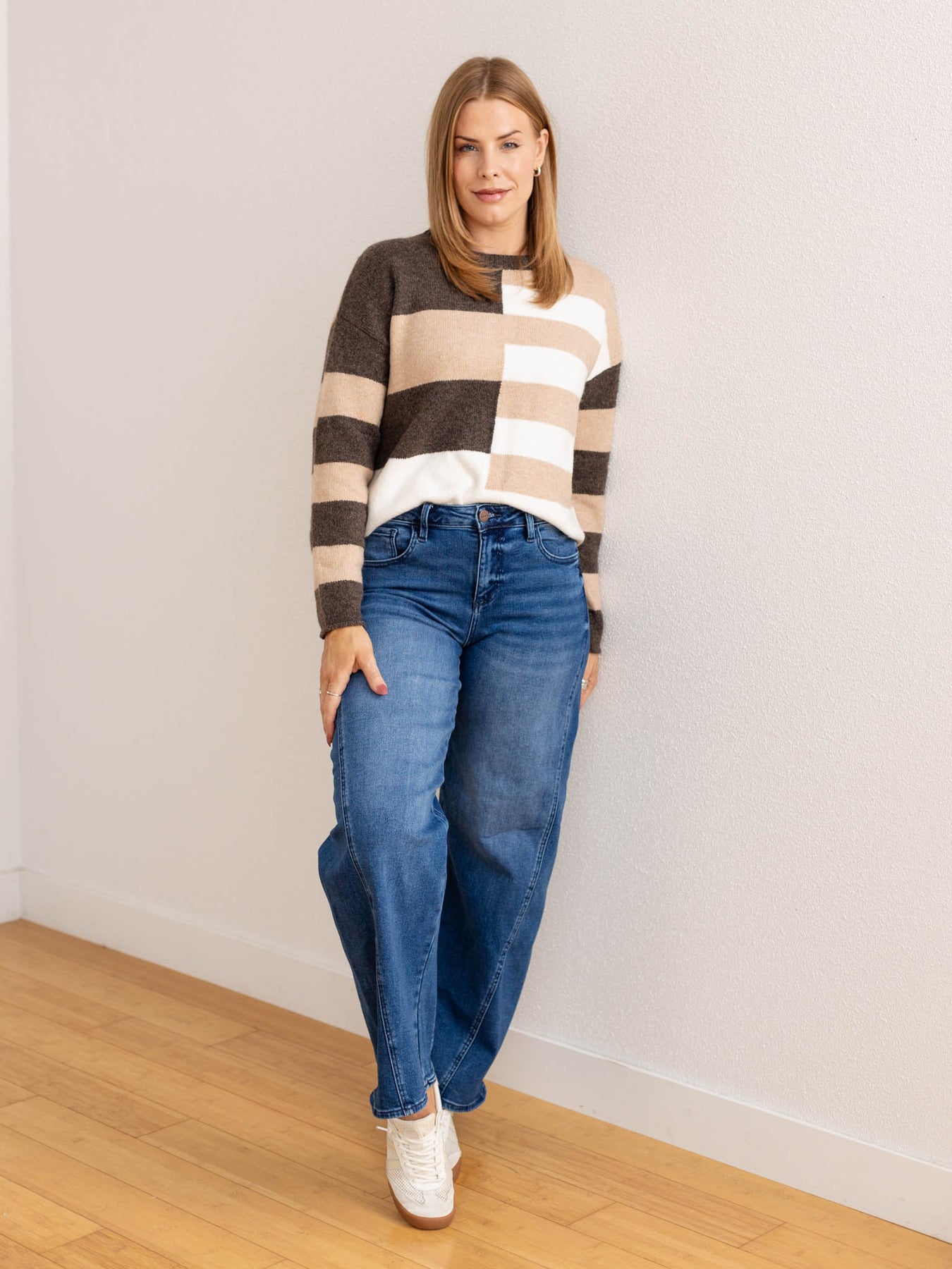 Cozy up in this playful crew neck sweater that's giving major fall vibes. The bold block stripe design adds personality to your everyday rotation, while the drop shoulder and relaxed fit make it the kind of piece you'll want to live in. Perfect for layering or wearing solo, this sweater brings effortless style and comfort to your seasonal wardrobe.