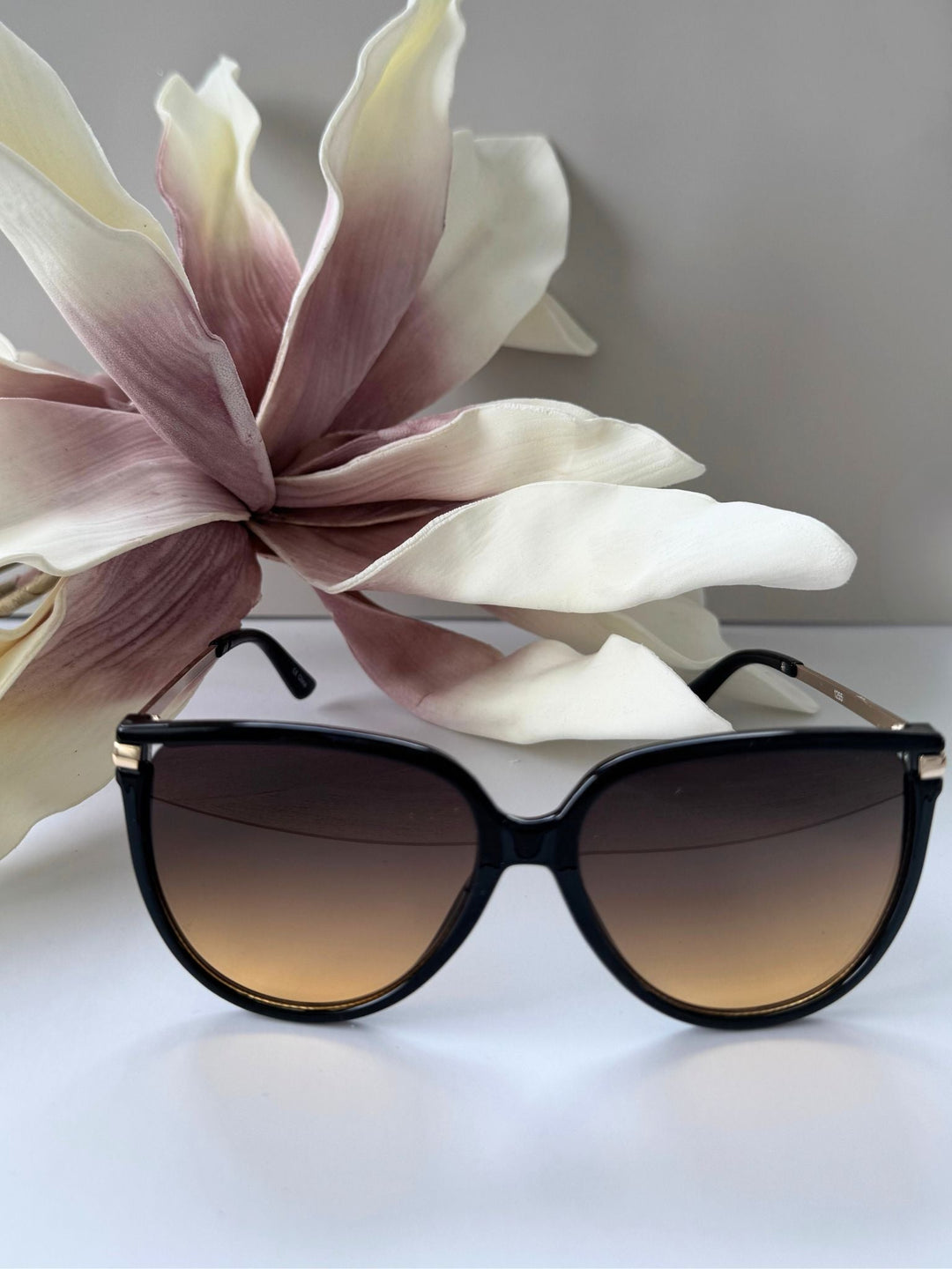 An oversized rounded, yet squared off sunglasses silhouette features a contrast lens accent for a fun + retro inspired vibe this season.