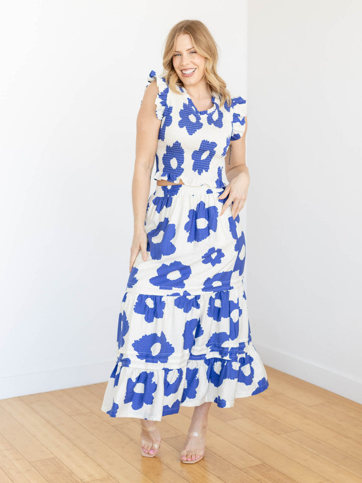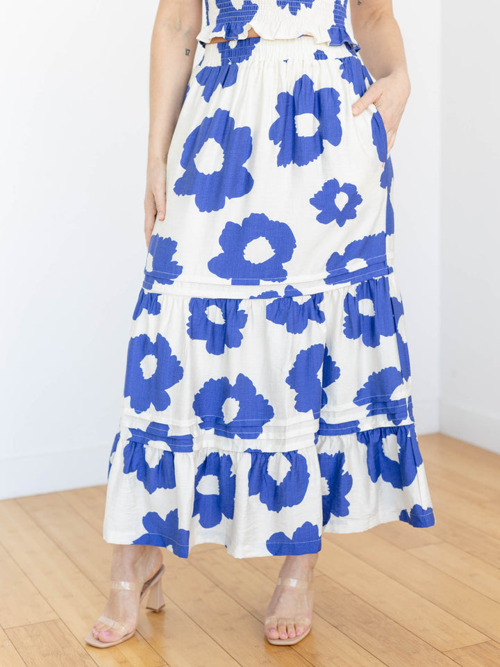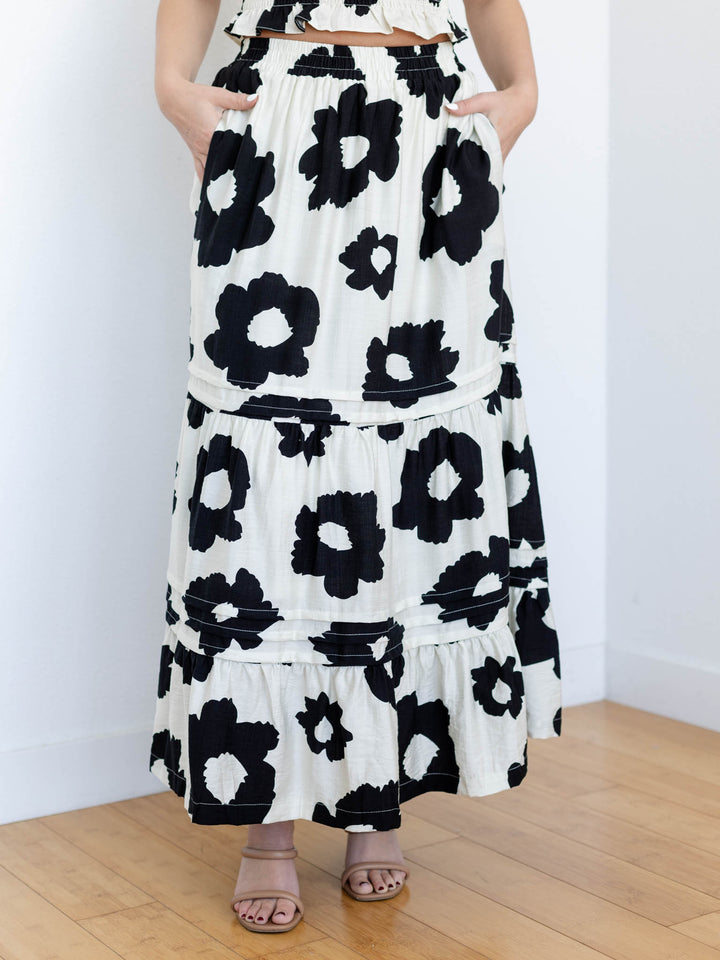 We love the bold, contrasting floral pattern that is featured throughout this longer, maxi length skirt. A tiered silhouette enhances the modern design of the pattern. A simple elastic waistband allows for easy and comfortable styling. Style with the coordinating top or pair with a basic tank or sweater for a versatile addition to your wardrobe.