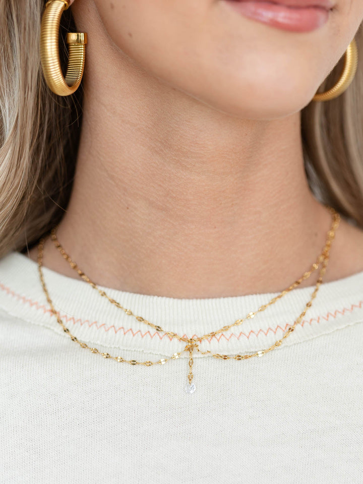 A textured, layered inspired look drapes down into a shorter necklace silhouette, complete with a single dangle stone for add glitz and glam. The perfect way to elevate any look.