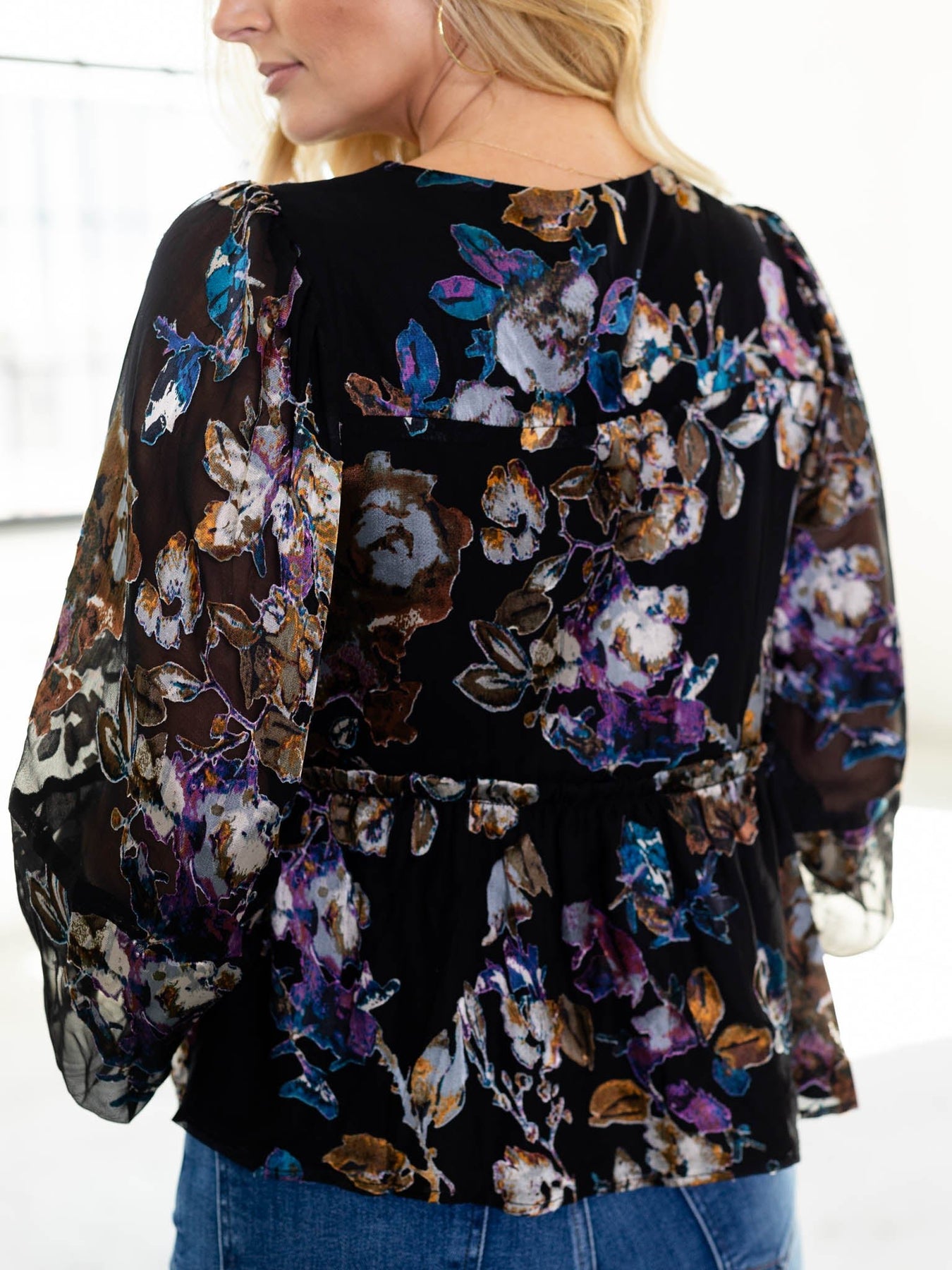 Embrace elegance with the By Together Floral Tie Front Blouse, featuring a gorgeous moody floral print that adds depth to your look. Sheer billowed sleeves bring a soft, airy touch, while the tie front accent highlights your waist for a flattering silhouette. Its flowy, romantic feel makes it perfect for both casual outings and special occasions, helping you feel confident and effortlessly stylish.