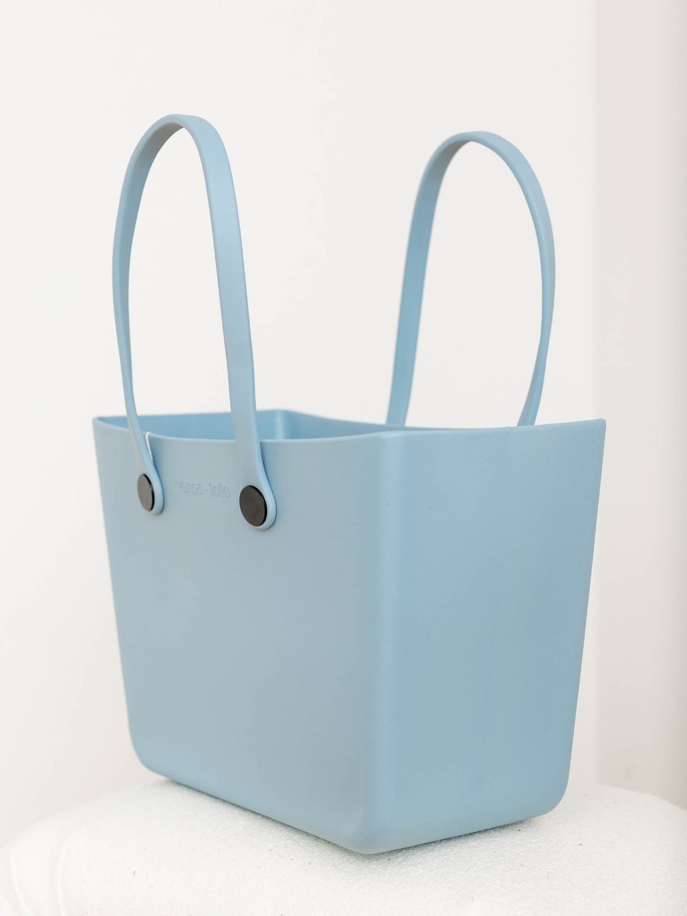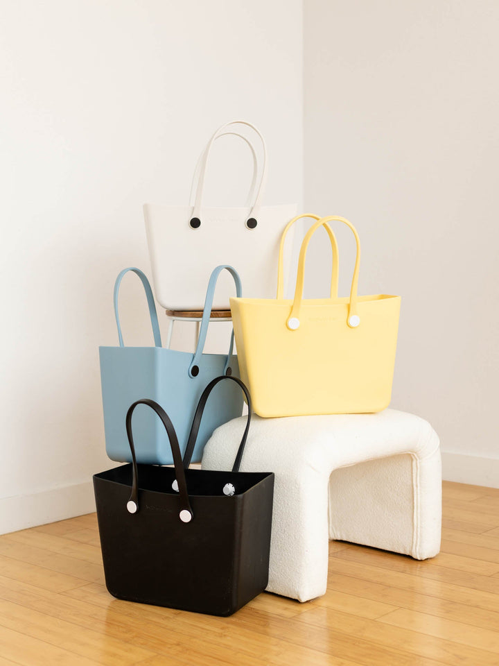 The perfect go-to bag for all of your summer adventures. This softly structured molded tote features a waterproof rubber fabrication for a durable go-to carry all!