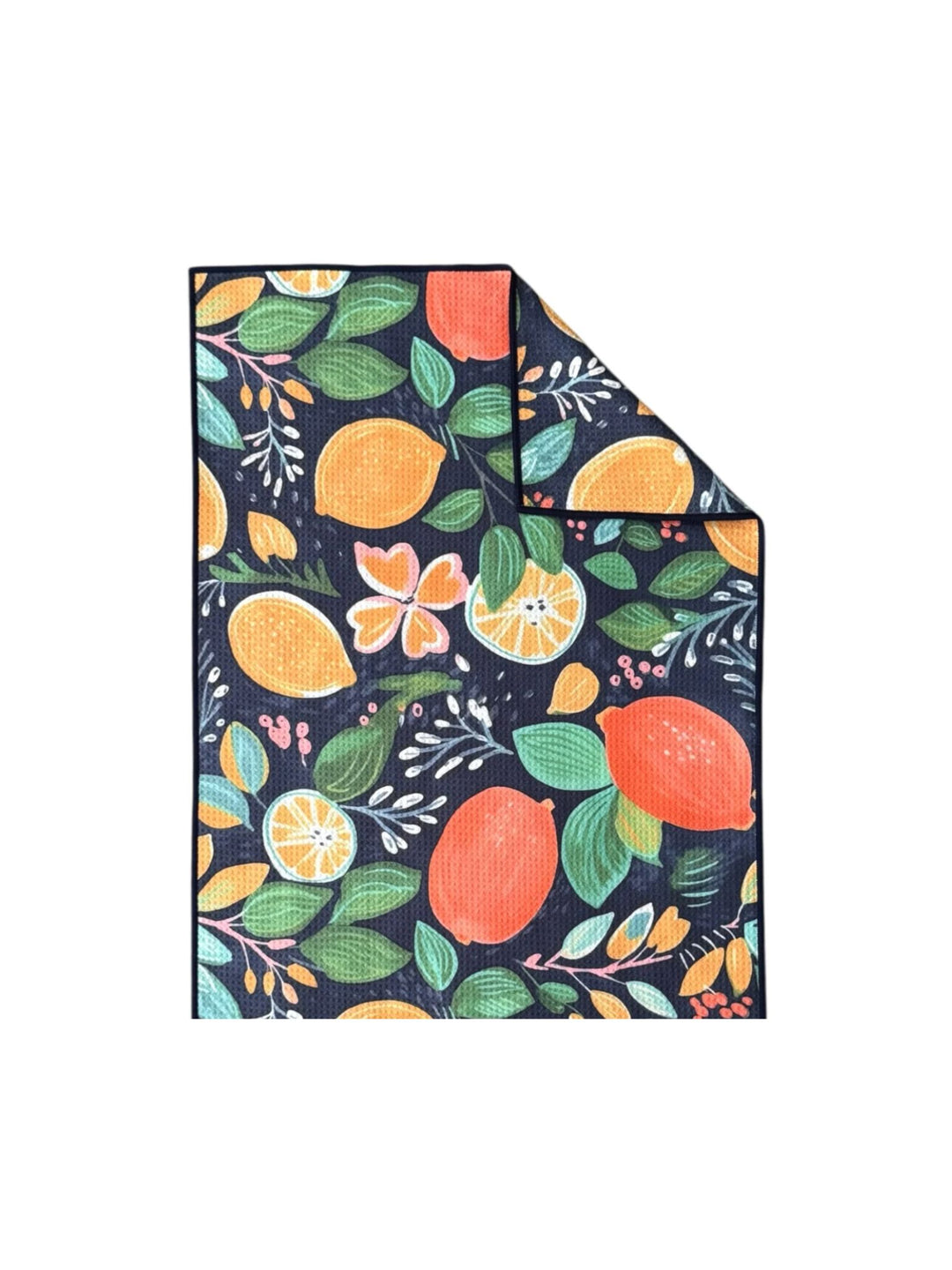 A fruity and colorful clementine pattern is featured throughout this double sided hand towel. Practical while still adding a chic touch to your kitchen or bar area.