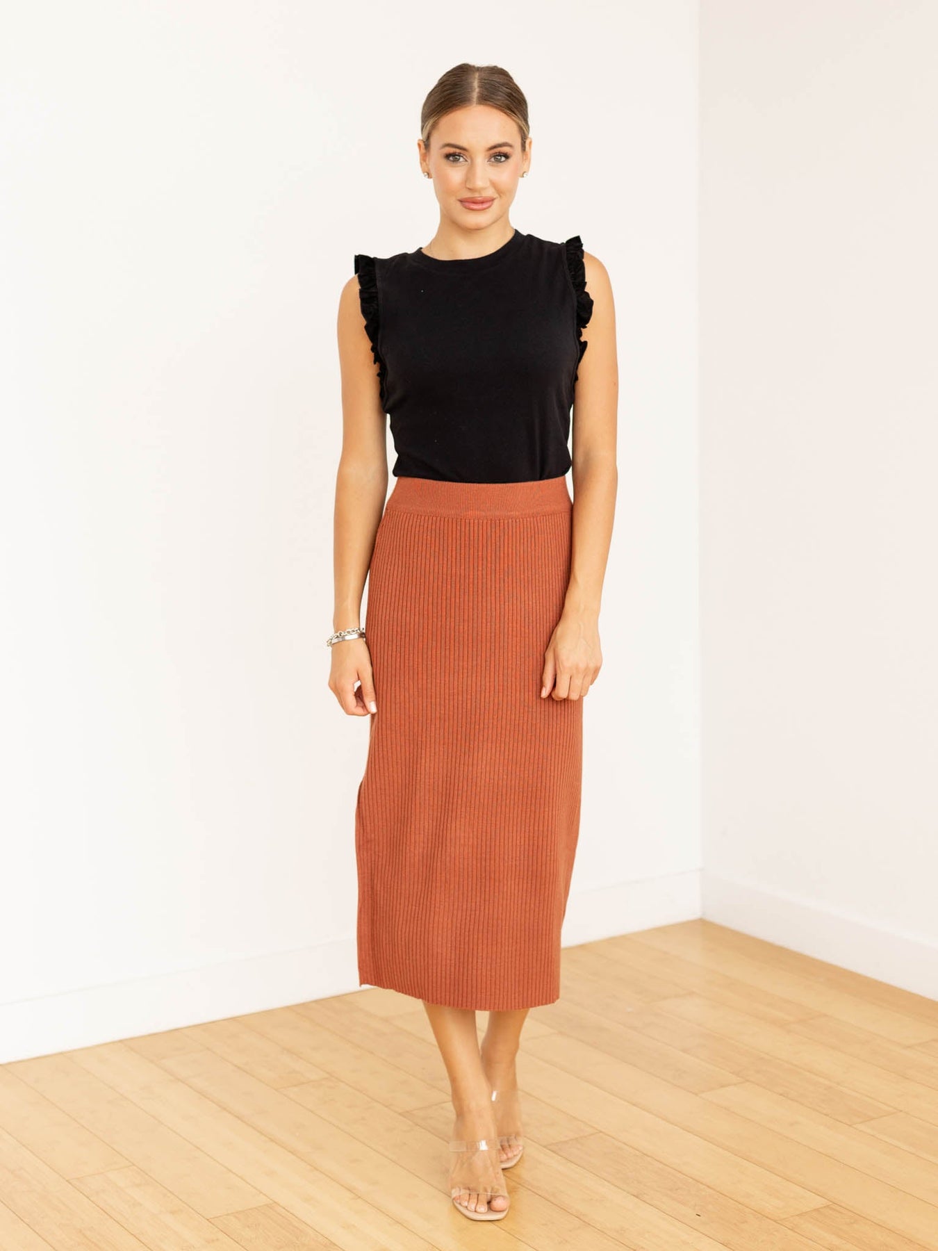 Black top has been styled with Ribbed Side Slit Midi Skirt