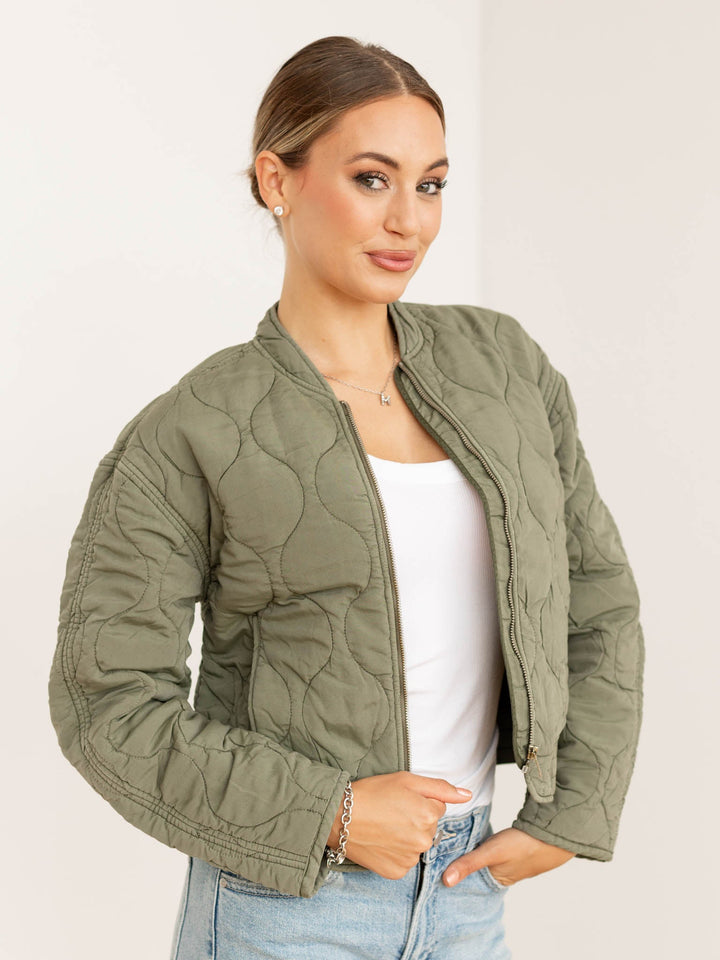 The Dear John Maverick Jacket brings a playful twist to fall layering with its quilted pattern and bomber-inspired silhouette. Featuring a zip front closure and softly structured design, it’s perfect for adding cozy charm to your cool-weather outfits. Embrace the season in style and comfort!