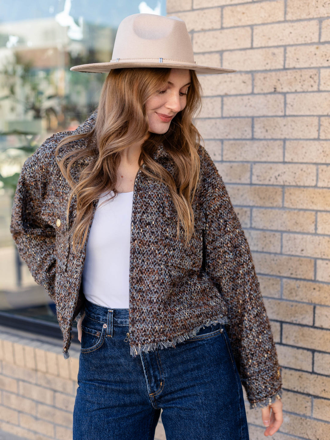 The Democracy Long Sleeve Patch Pocket Jacket offers a softly structured, boxy silhouette with a unique tweed-inspired design. Its zip-front closure makes it an easy layering piece, adding both warmth and style to your outfit. Perfect for those seeking comfort without compromising on a distinctive look.