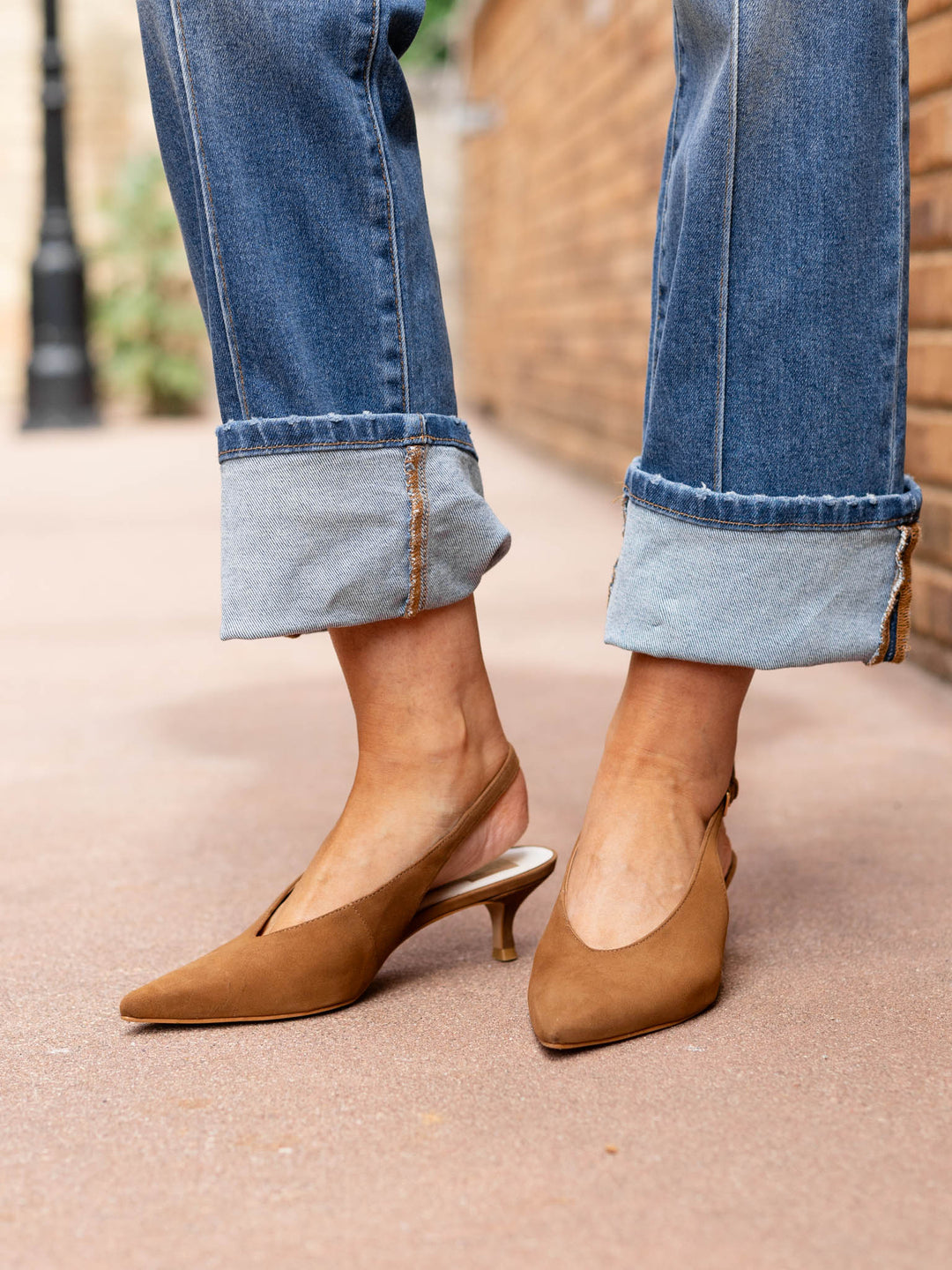 Elevate your style with the Dolce Vita Alenna Pointed Toe Heel. Crafted in soft suede, this chic slingback features a flattering pointed toe and a comfortable kitten heel, perfect for all-day wear. Its elegant silhouette adds a sophisticated touch to any outfit, making it a versatile choice for both work and evenings out. Step confidently and effortlessly in these timeless heels.