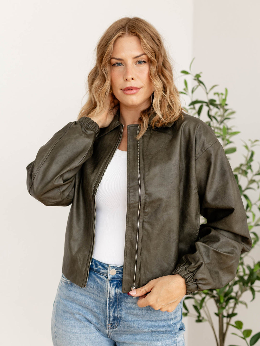 Step out in style with the Elan Faux Leather Bomber! This playful jacket features a sleek zip front closure, a cool collar, and a comfy elastic hem that keeps the vibe relaxed. With handy side pockets and a trendy boxy fit, it’s perfect for adding a little edge to any outfit while keeping things effortlessly fun.