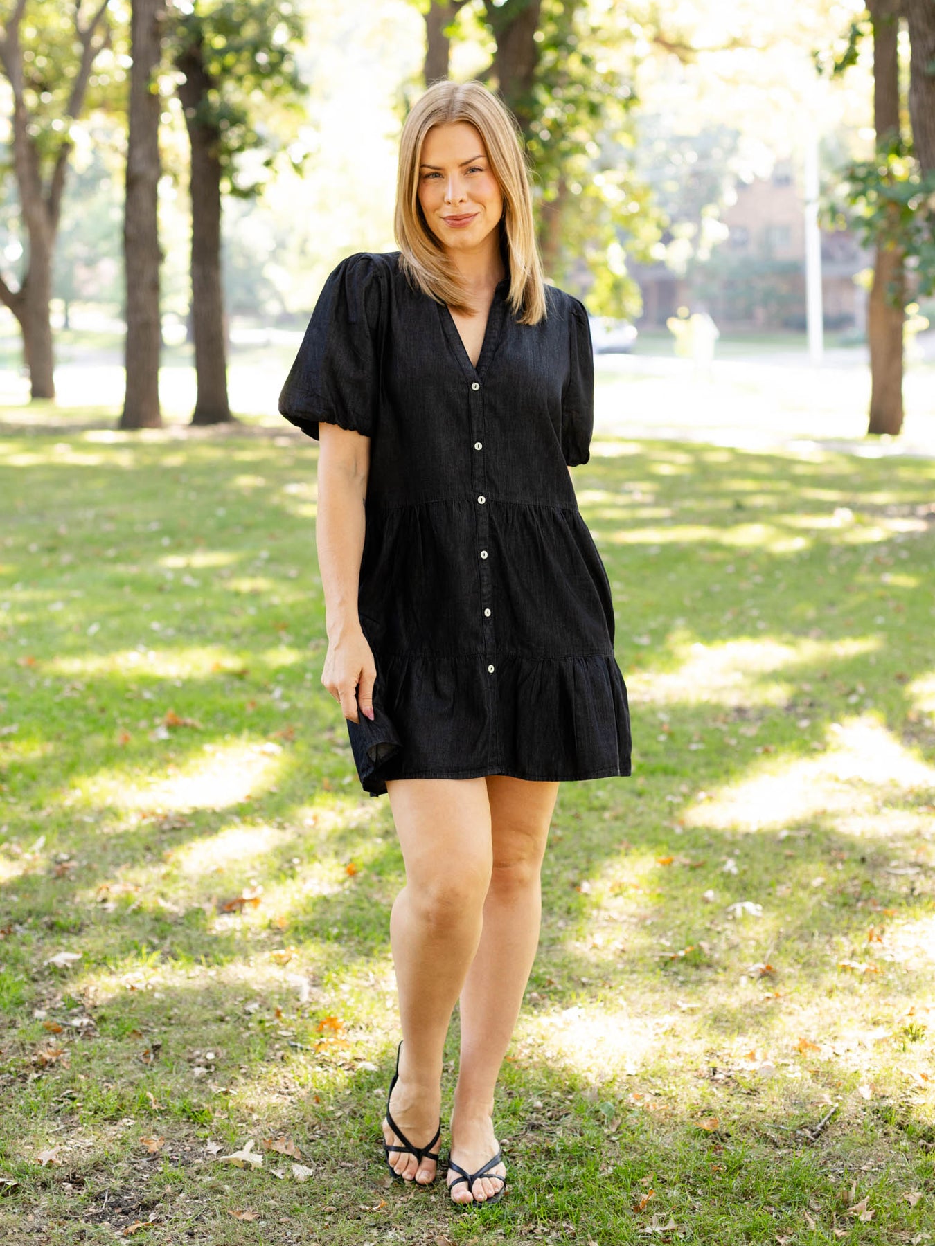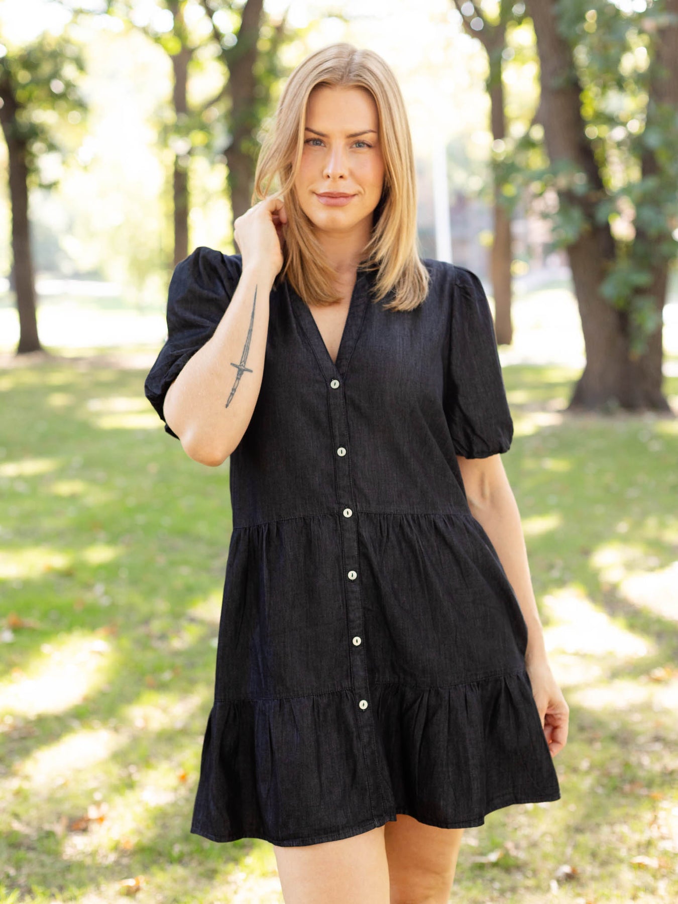 Add some playful charm into your wardrobe with the Elan Tiered Button Front Mini Dress. Featuring a collared neckline and button-front design, this dress blends denim-inspired fabric with a flirty, flowy tiered silhouette. Its western boho vibe makes it perfect for sunny days and fun nights, effortlessly combining casual cool with feminine flair.
