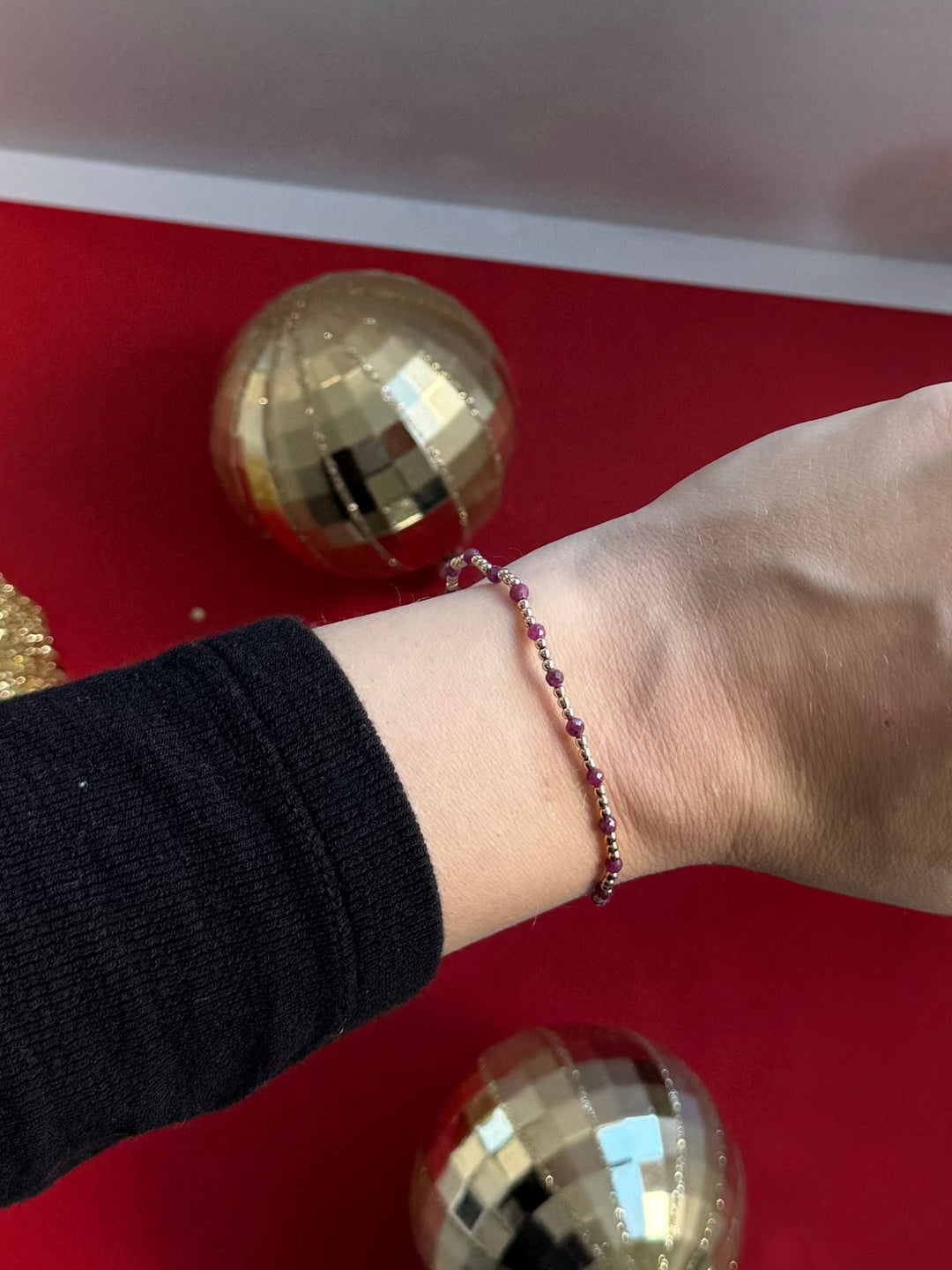 A pattern of larger ruby beads + gold metal ball beads combine on a stretchy bracelet band for a fun and rich pop of color.