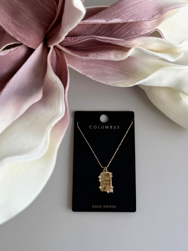 A dog tag inspired design features a tiny "Faith over Fear" inscription along with some crystal accents for a fun + inspirational message.