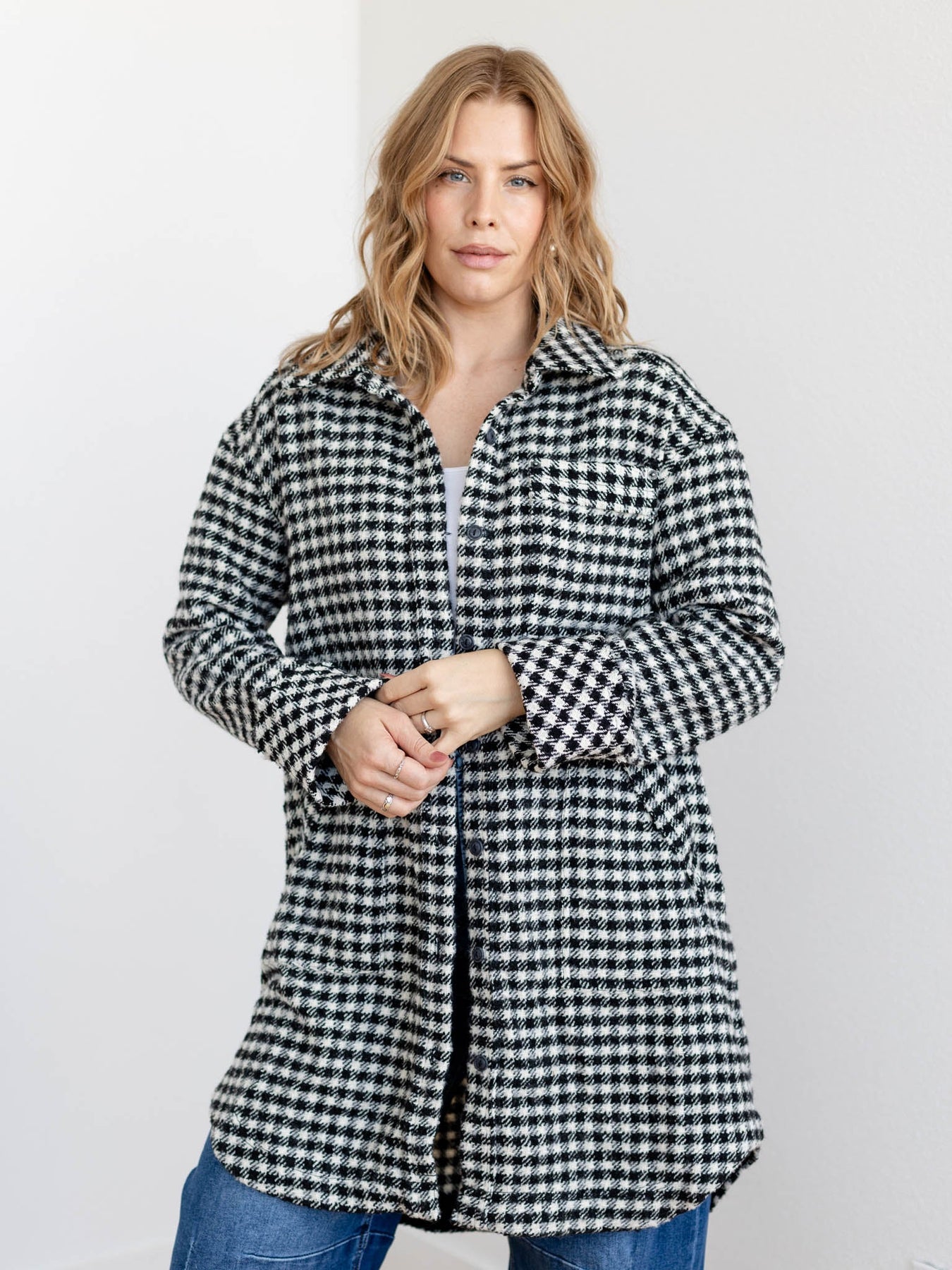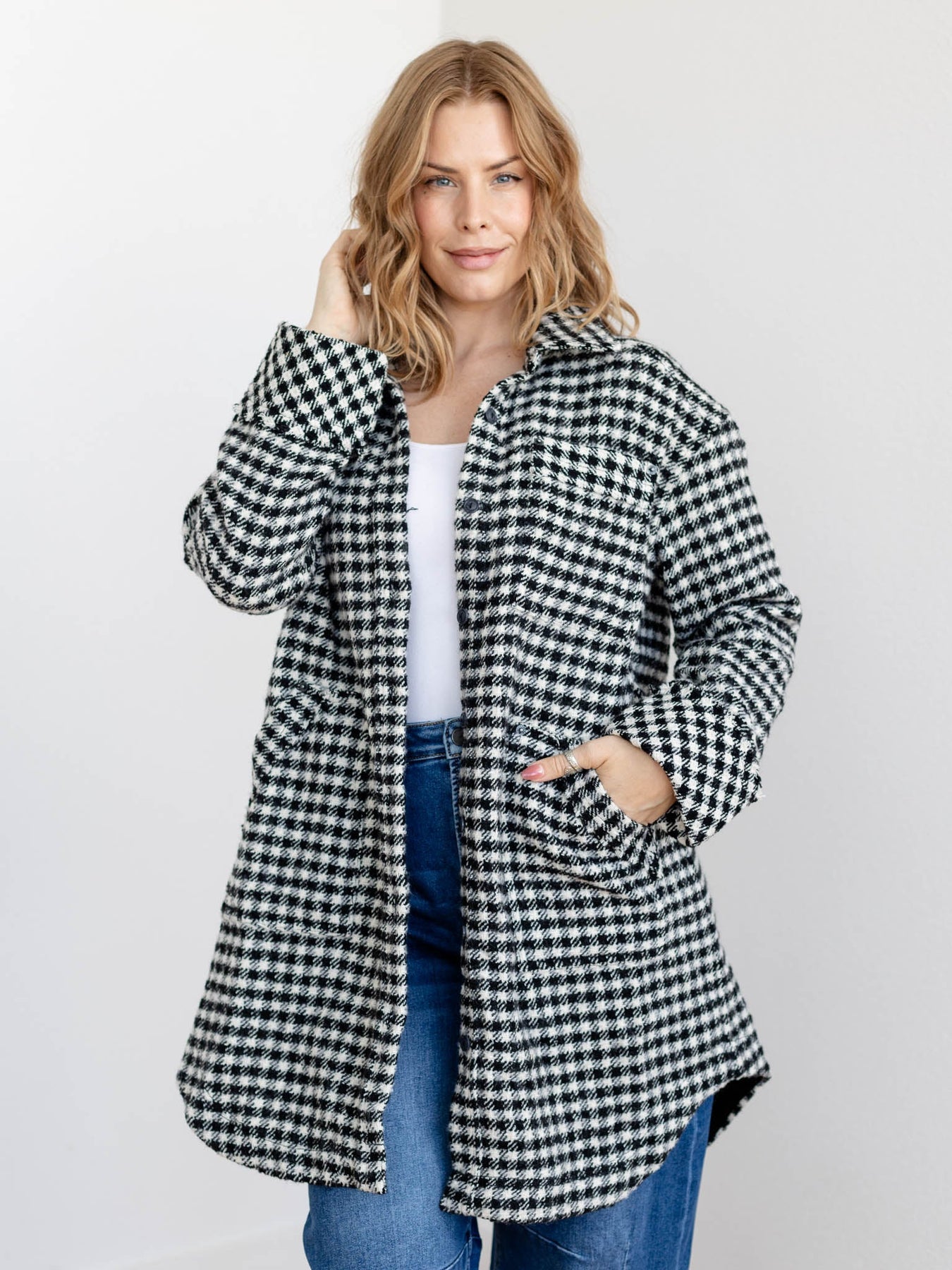 Throw on this effortlessly cool houndstooth shacket and embrace that laid-back vibe. With its oversized silhouette and longer length, it's the perfect piece for layering or wearing solo. The bold houndstooth print adds instant personality to any outfit, while the relaxed fit keeps things comfortable and casual. Whether you're running errands or meeting friends, this shirt jacket is your go-to for that coveted easy-going style.