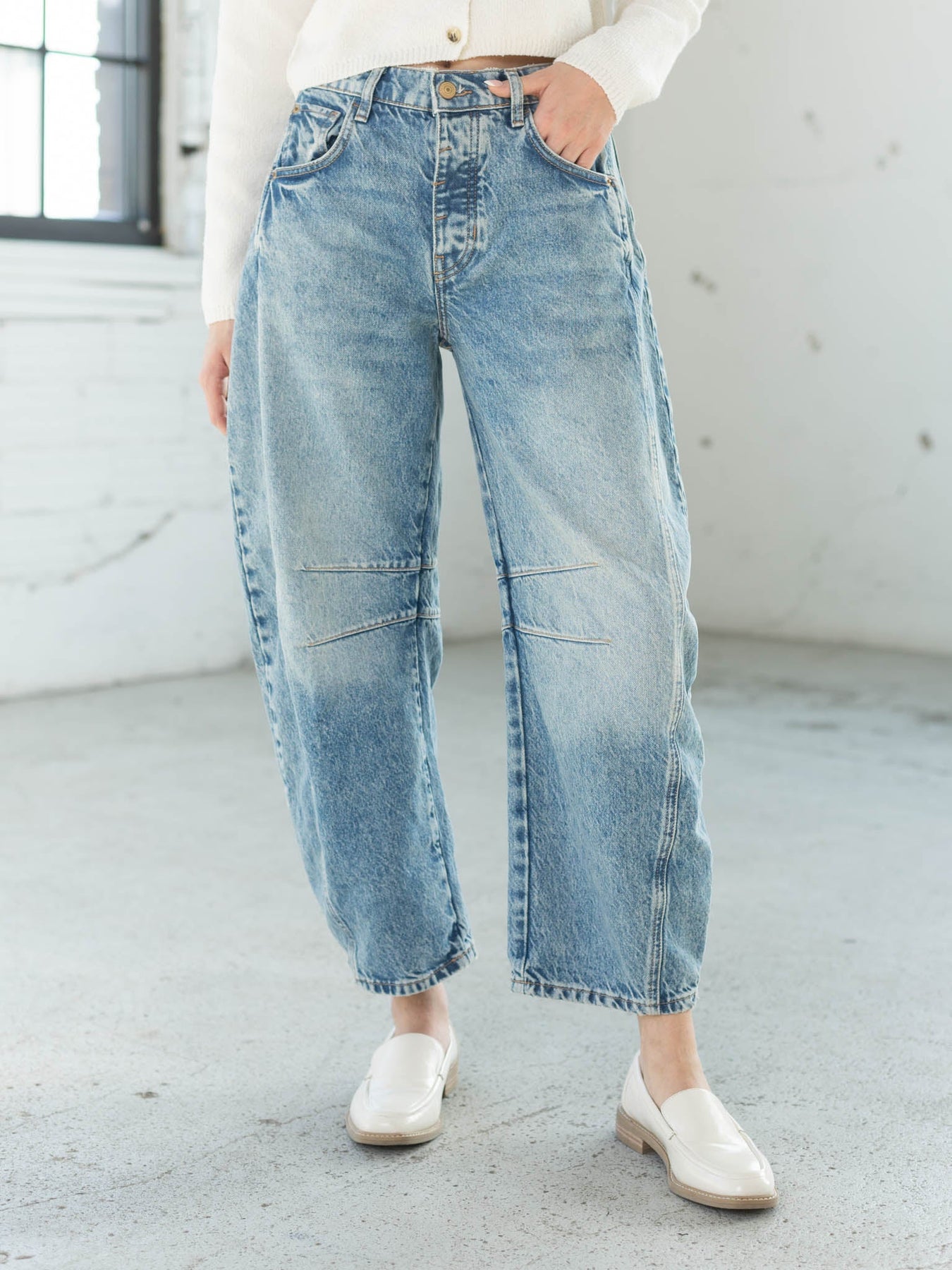 More of a true take on a barrel silhouette, this new arrival from Free People allows an ultra carefree and relaxed look with the baggy, wider silhouette. Unique seaming and darting details add to the extreme barrel design of these new arrivals. A vintage inspired wash and mid-rise fit add to the overall cool and casual vibes of this look.