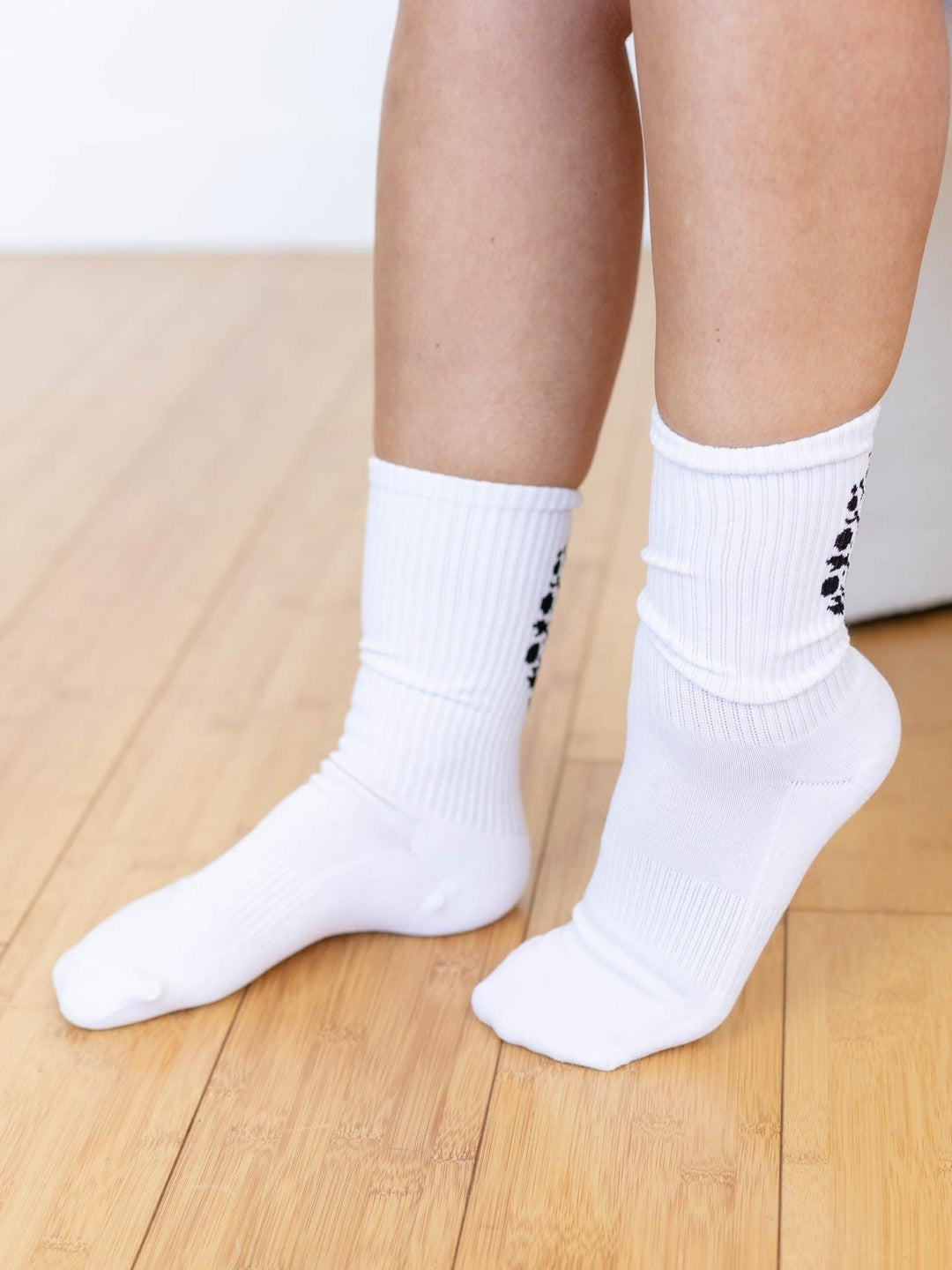 A classic tube sock design features a printed logo along the back for a fun and playful appearance.