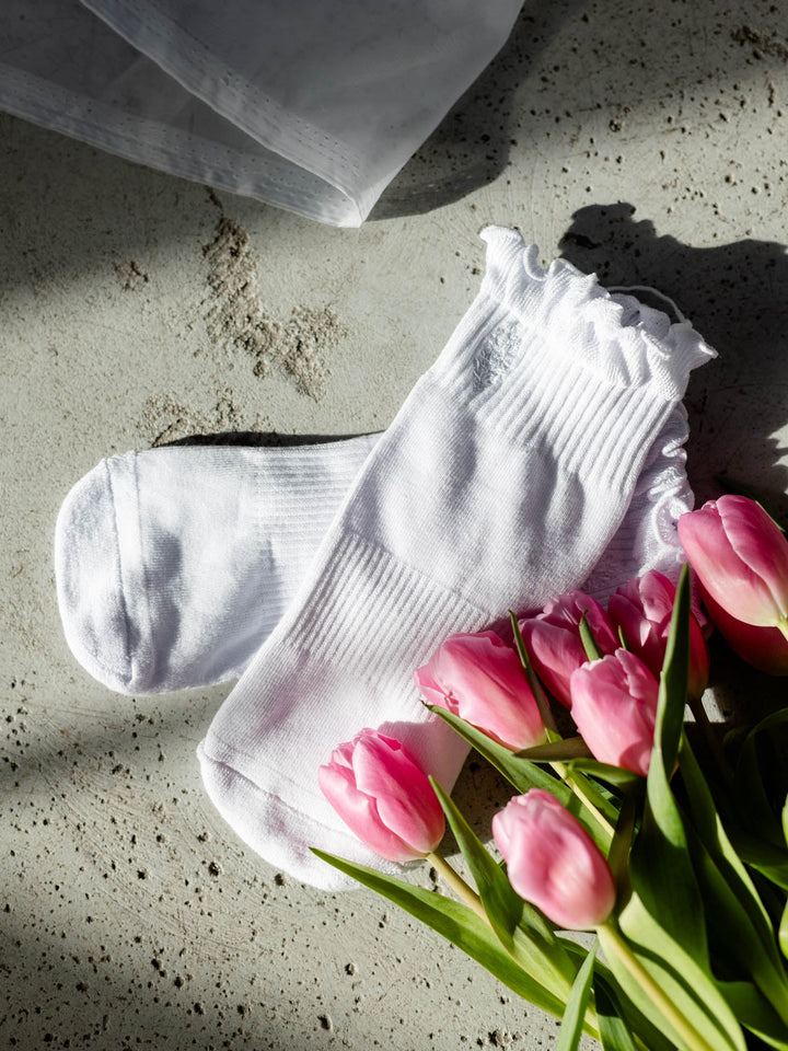 Athleisure inspired with a feminine flair, this short socks feature a ruffle detail design to add a playful and charming touch.