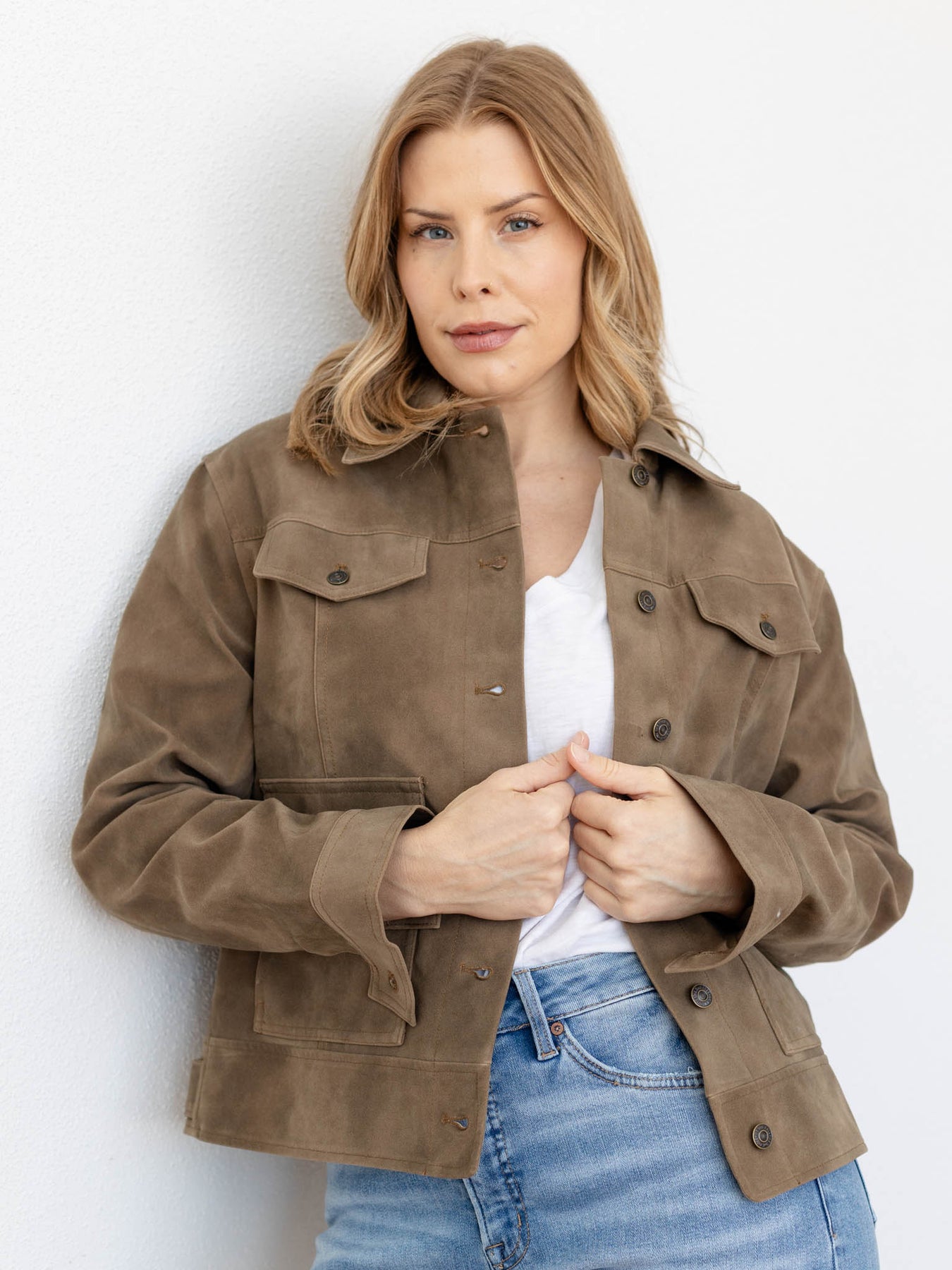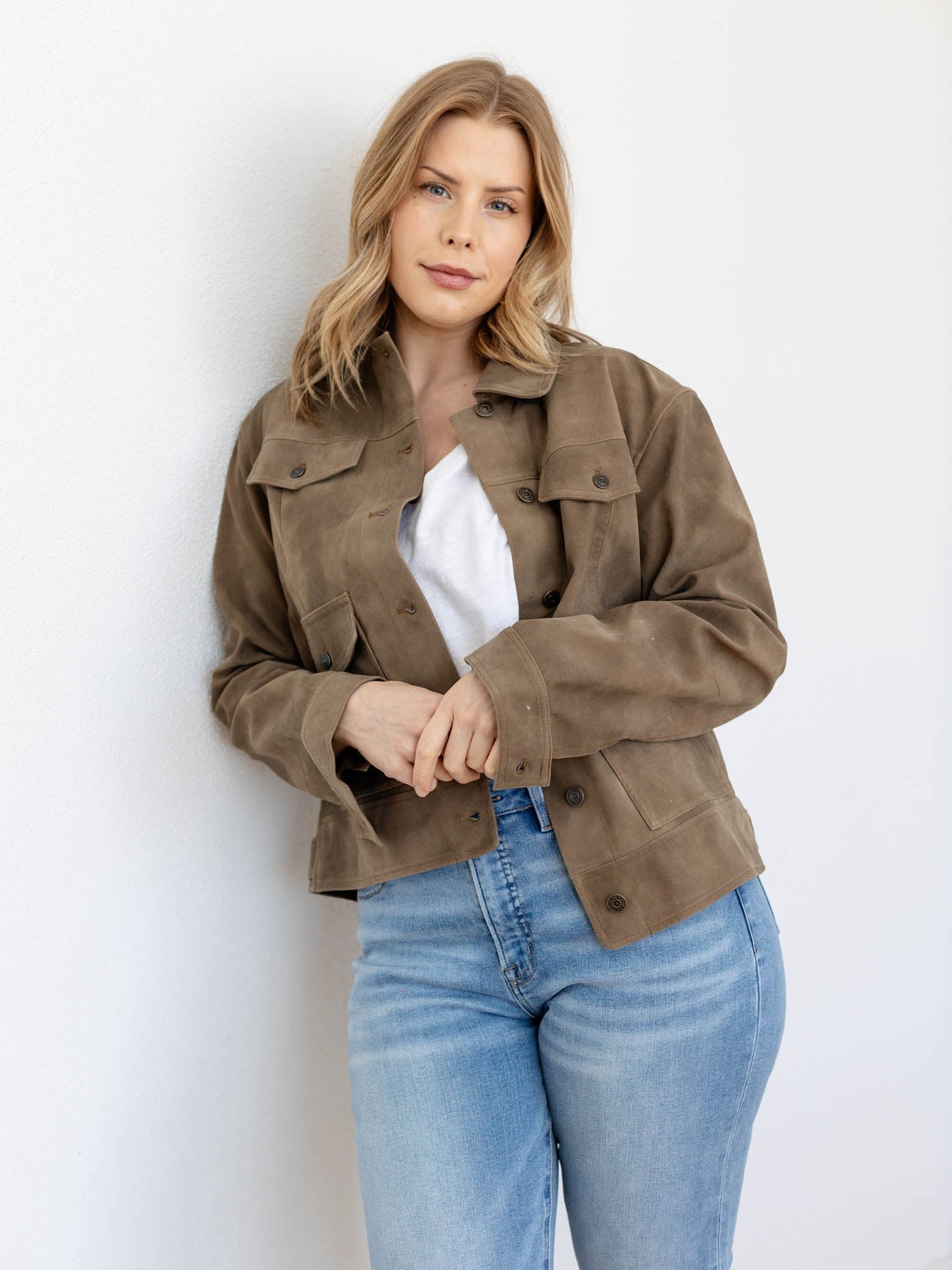 Layering pieces are a necessity as the seasons change, and this new arrival from Free People adds a trending, cool + casual vibe to any look. A slightly more rigid and structured vegan jacket adds a boxy + oversized fit to your jacket design. Pocket details and functional buttons add a utility insipred look that we love.