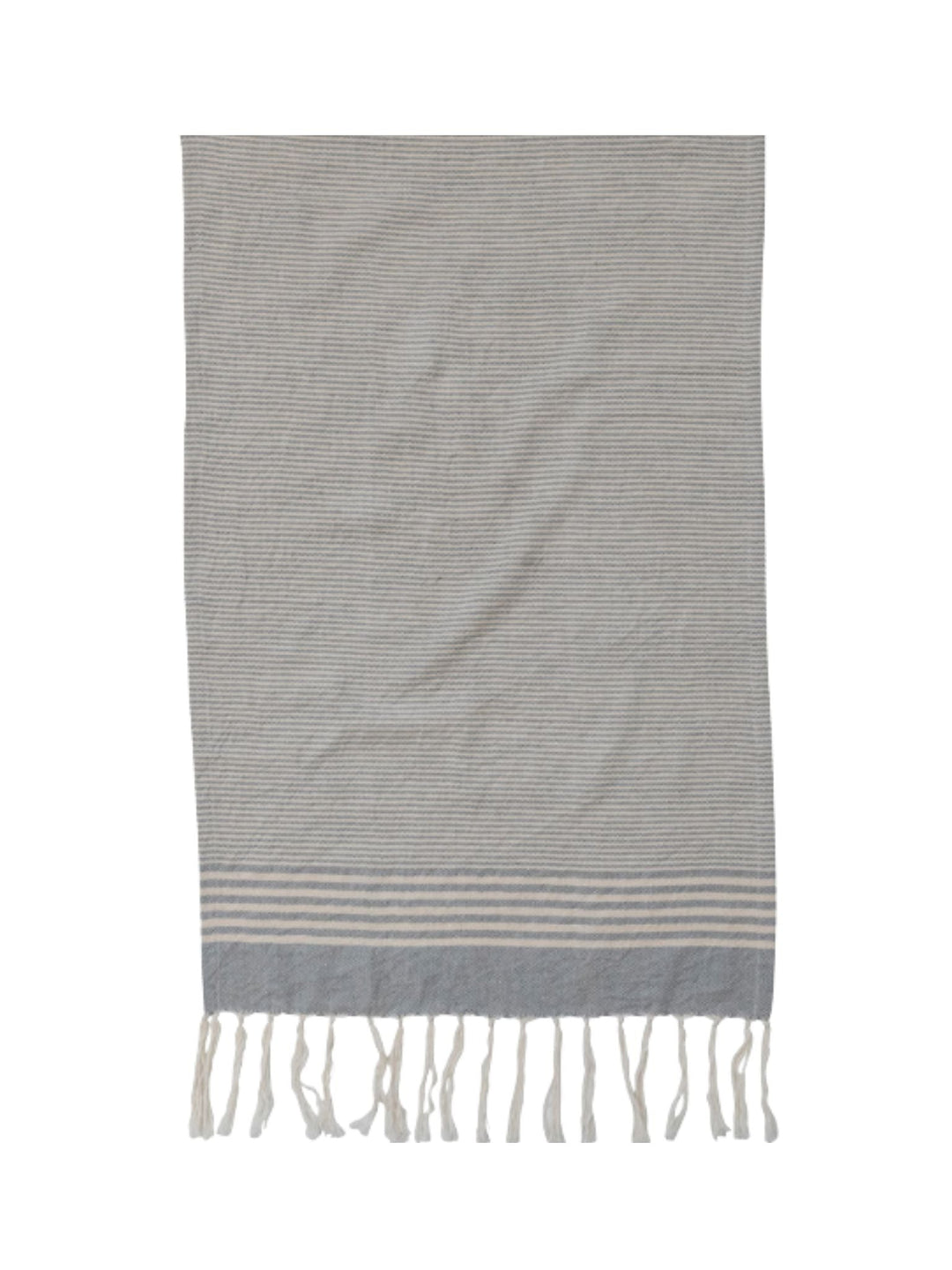 Stripes of varying sizes are featured throughout this neutral inspired tea towel. A fringe detail at the bottom adds a fun and playful touch.