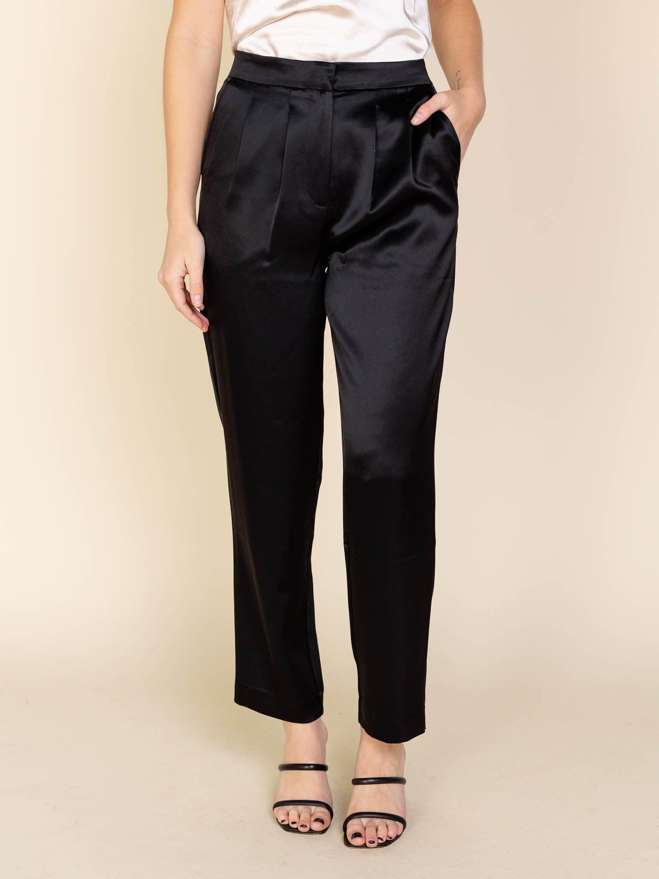 These pleated high waisted pants will give you a polished look for the office or holiday event. The trouser style with pleats is a classic look. Made of comfortable satin fabric you'll be able to wear these all day or night.