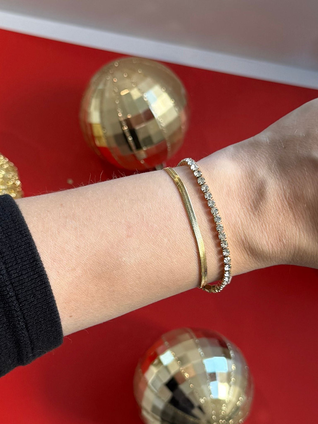 A two-for-one special features a tennis bracelet and a flat herringbone style bracelet to add the perfect finishing touch to any look.