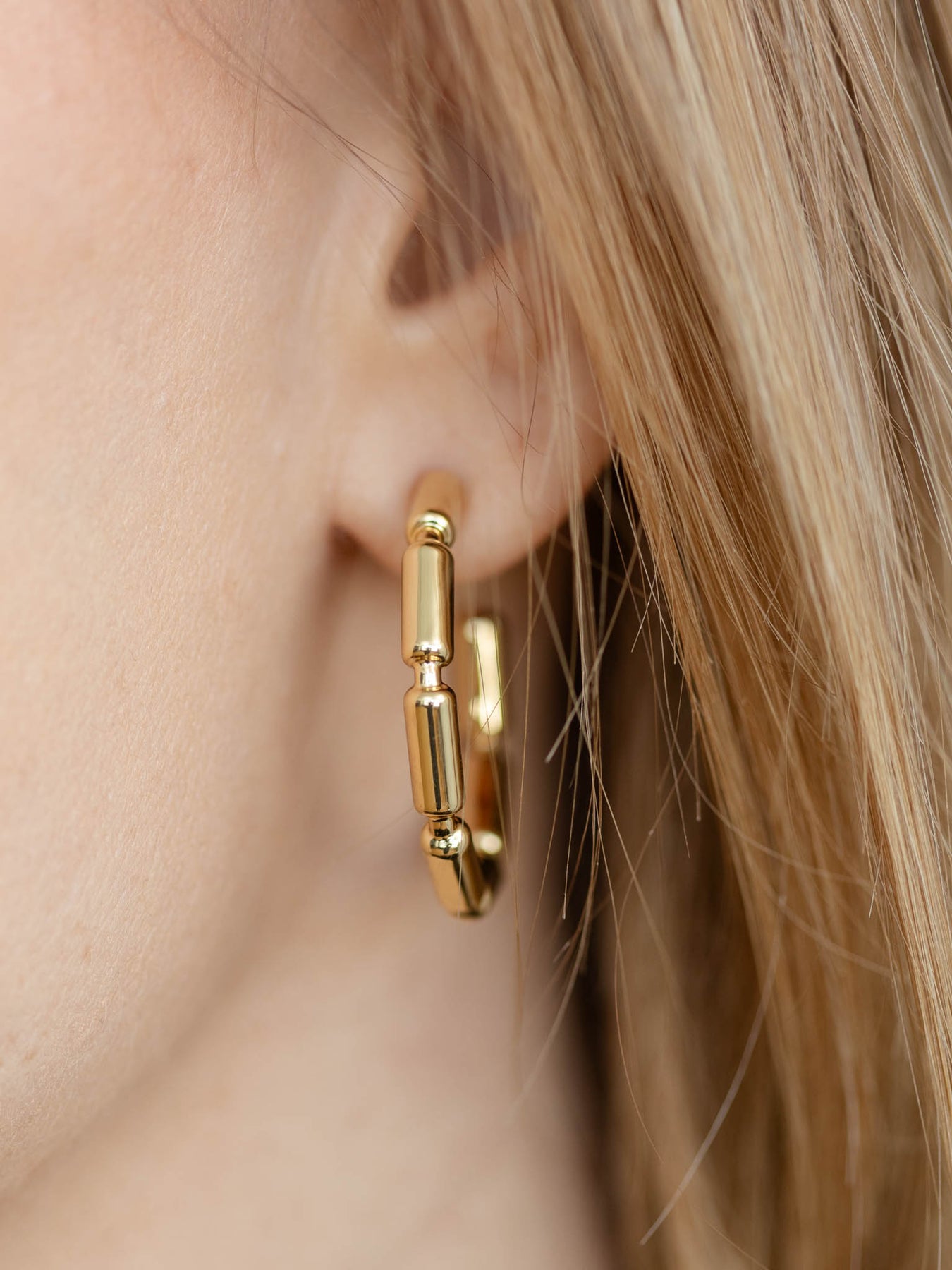 We love the textured elongated bead accent that gives these hoop earrings a more casual and slightly edgy look and feel.