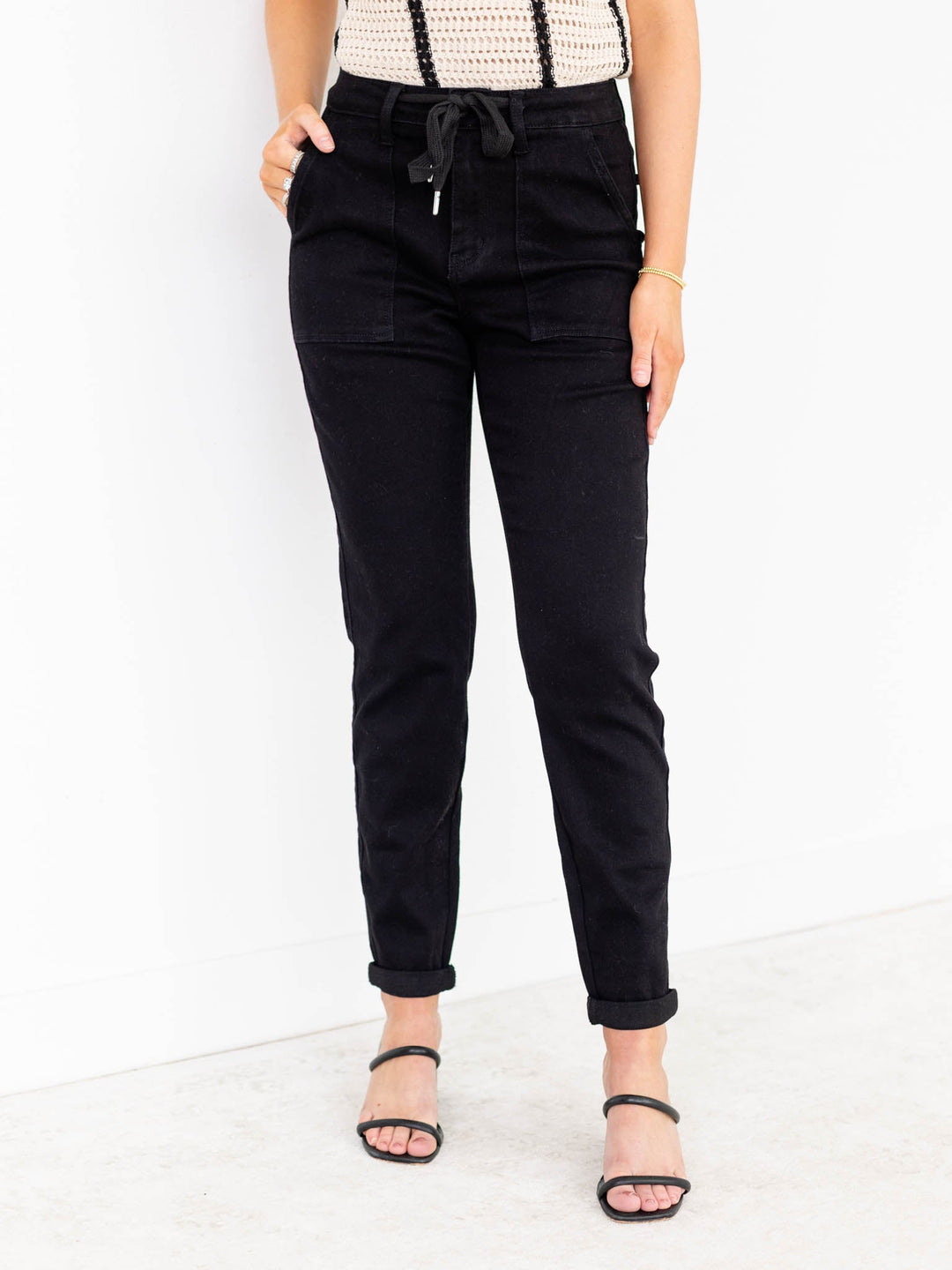 A fun and new take on a denim look, these new arrivals from Judy Blue are a trendy update to your tried and true looks! The stretchy denim fabrication ensures a comfortable fit while the utility-inspired design adds a trendy touch. The high rise and tie waist detail create a flattering silhouette. Elevate any casual look with these stylish and versatile joggers.