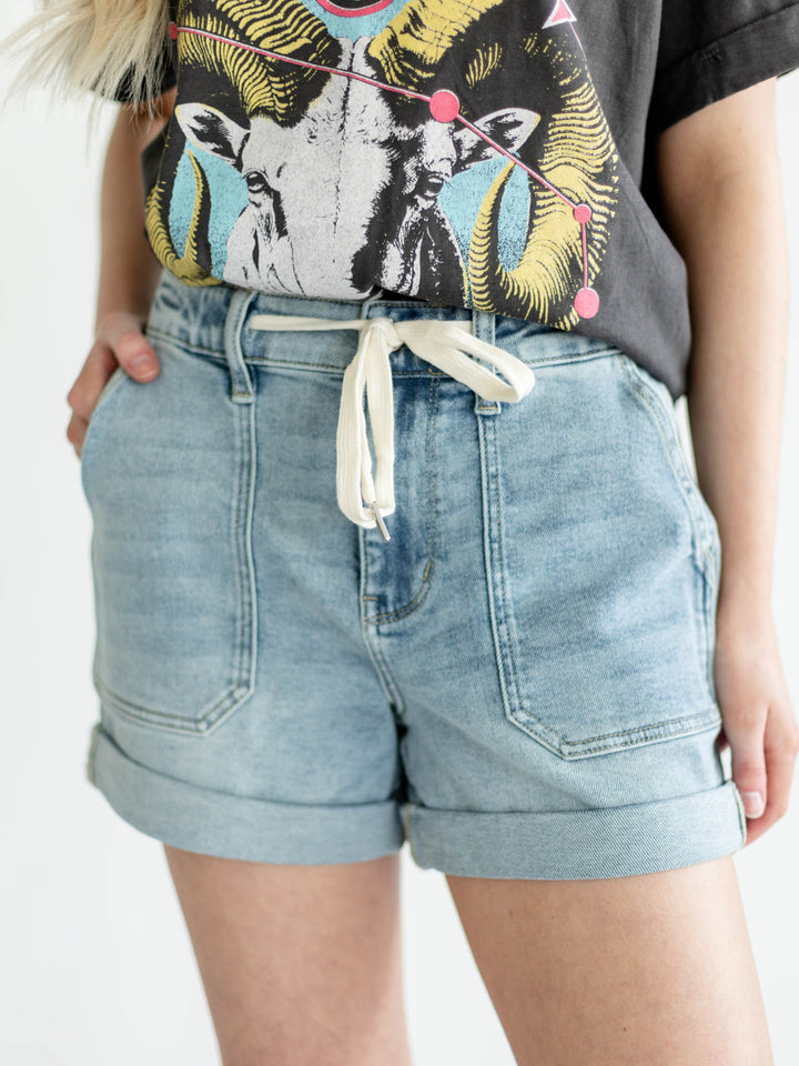 A unique and unexpected update to denim shorts of seasons past, these new arrivals from Judy Blue provide a trending, yet comfortable everyday appearance. Starting off with the high rise design, these lighter wash shorts feature a washed design down to the roll cuff hemline. A tie belt accent adds to the overall casual vibe of these shorts. An easy go-to for daily wear, these will quickly become a go-to staple for your summer style.