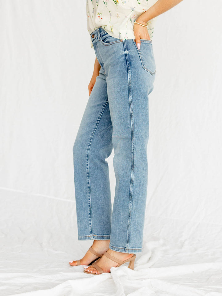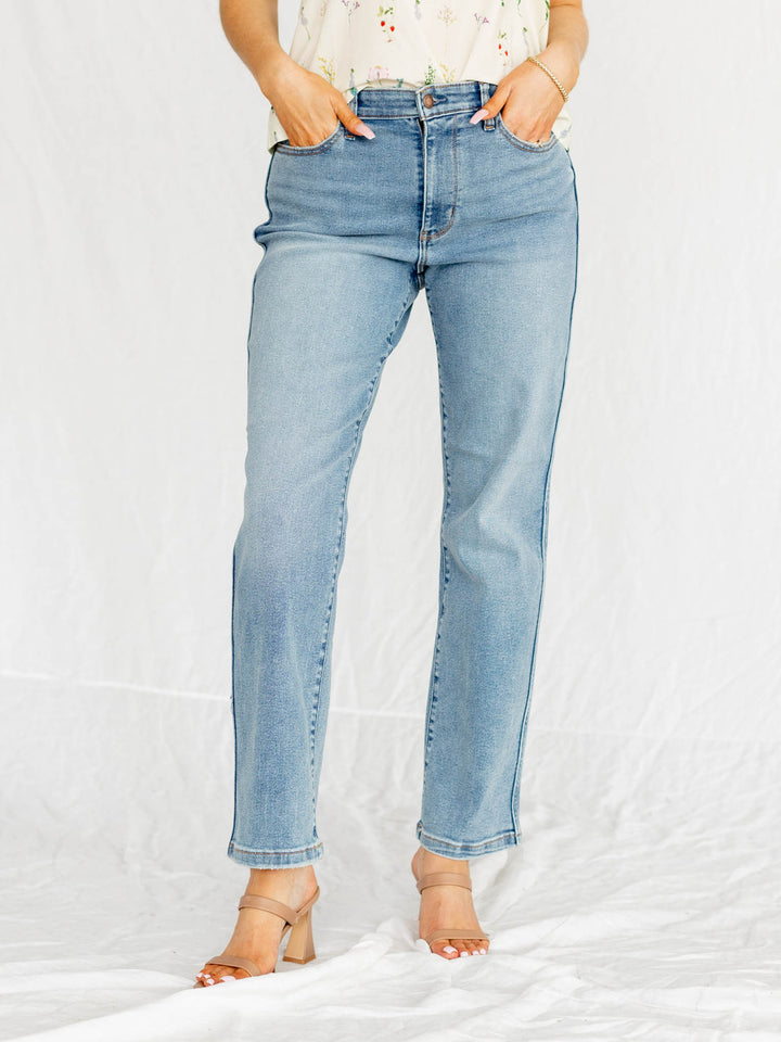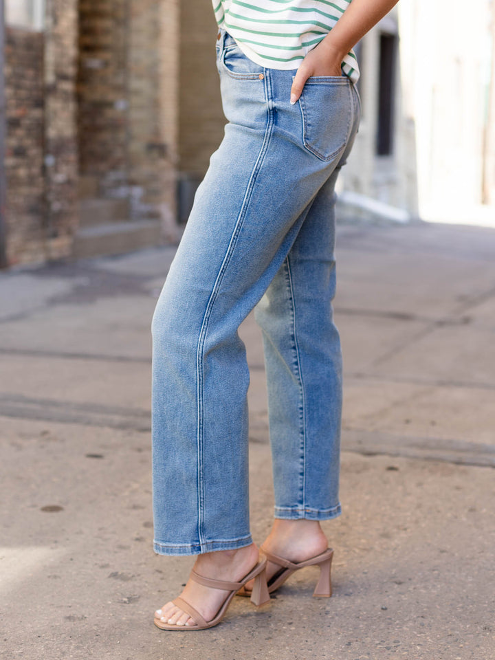 An easy going, everyday kind of jean is featured with this new arrival from Judy Blue. A soft and super stretchy medium wash is featured throughout a simple straight leg silhouette. This high rise jean is a great go-to for easy, everyday wear all year long.