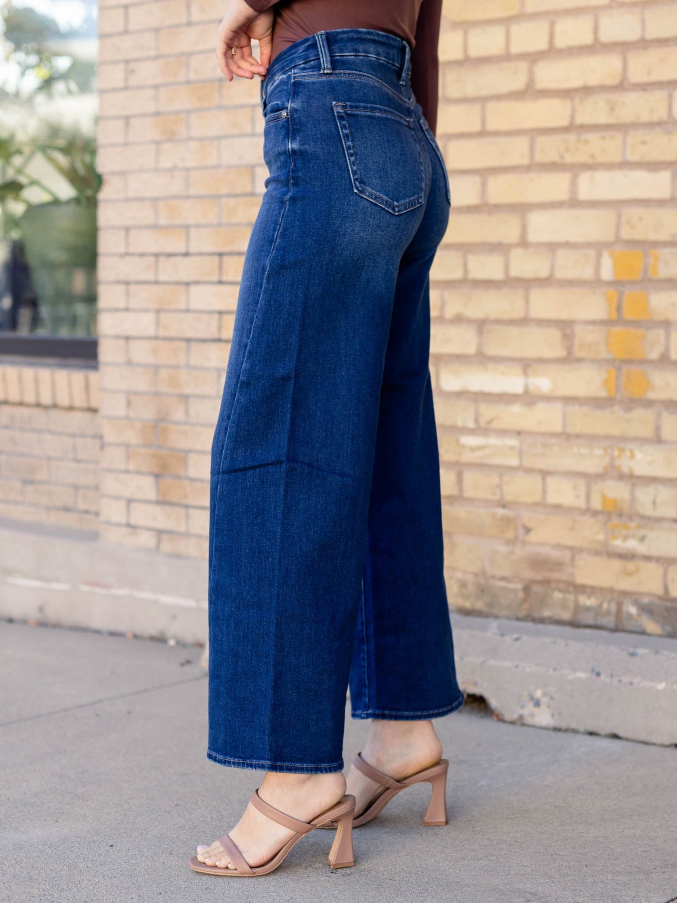 These dark wash jeans combine a high-rise fit with a flattering wide leg silhouette that enhances your natural shape. Unique side seam accents add a touch of distinctive style, while subtle distressed details at the hem provide just the right amount of edge. Designed for comfort and confidence, they’re perfect for elevating your everyday wardrobe.