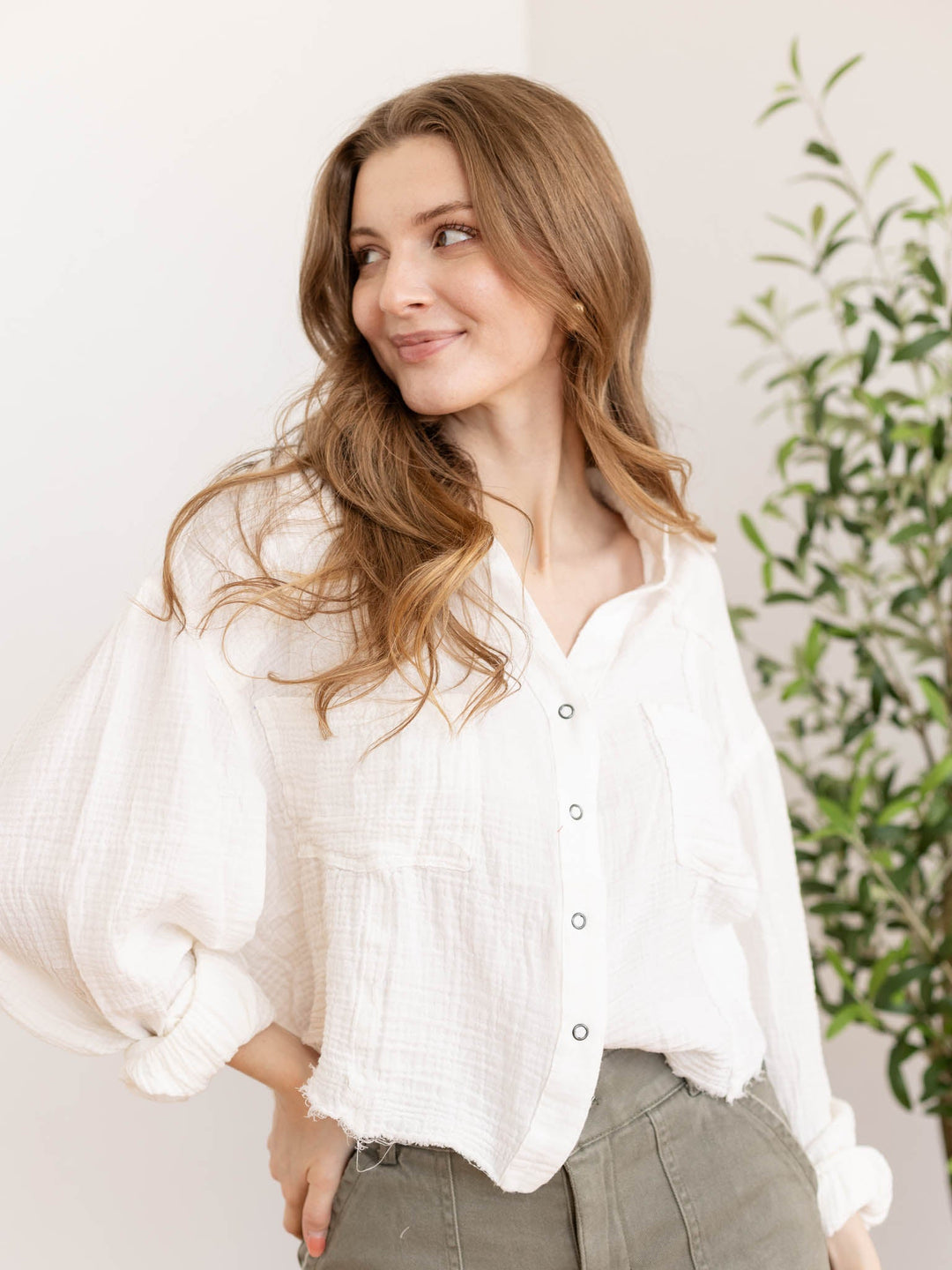 Stay cool and comfortable in this new arrival. The breezy gauze fabrication and classic collar provide a more casual twist to the traditional button up. With roll cuff sleeves and a shorter, boxy silhouette, this top is perfect for a relaxed and effortlessly stylish look.