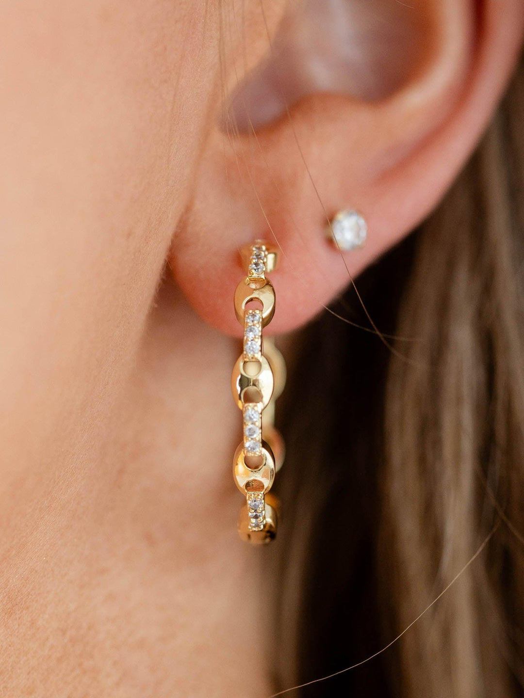 These smaller hoop earrings feature a textured silhouette complete with cubic zirconia accents featured throughout to add a hint of glitz + glam to the overall appearance.