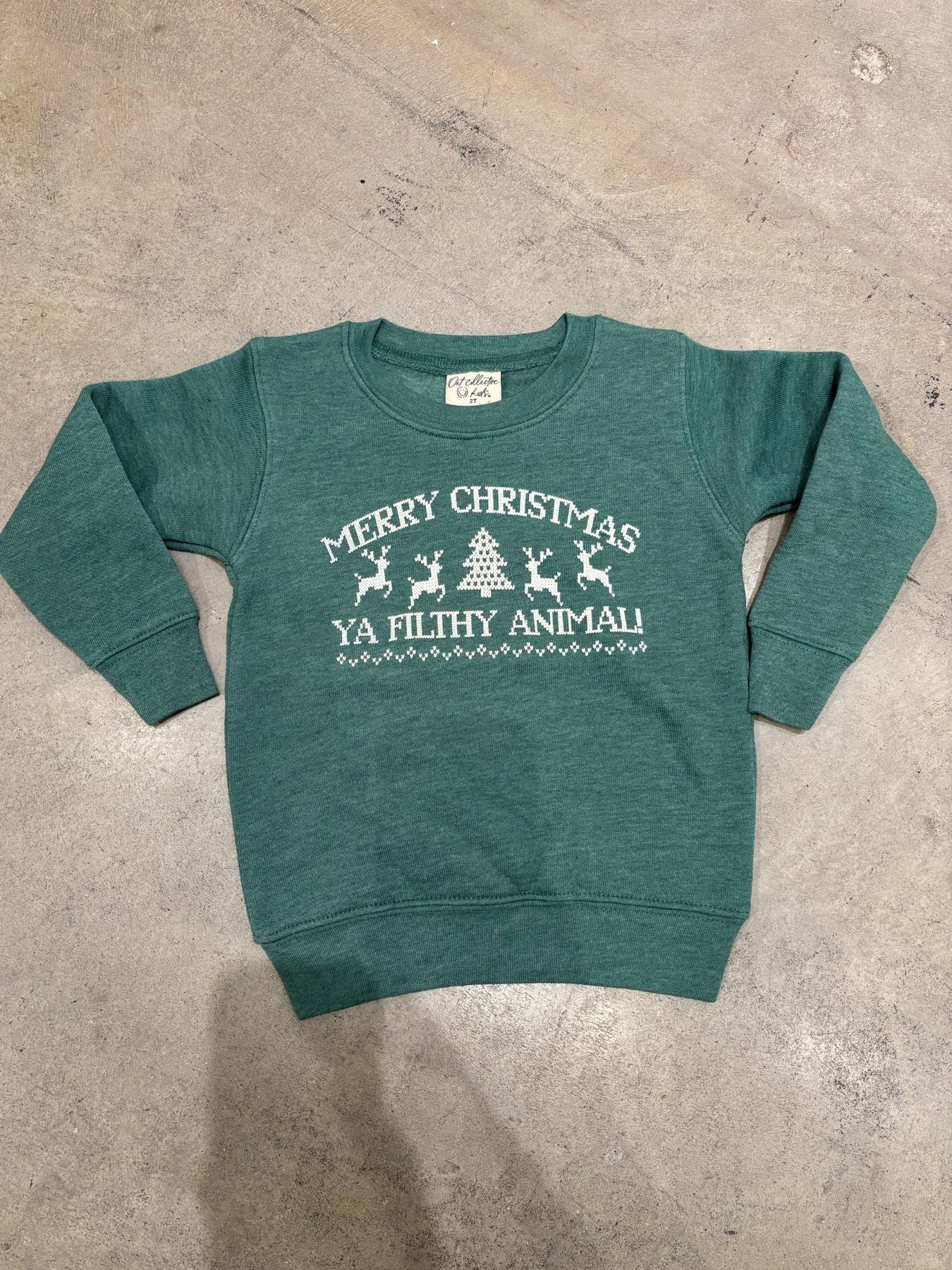 "Merry Christmas ya filthy animal!" This cozy sweatshirt brings iconic holiday humor to your littles wardrobe. Featuring a classic crew neckline and irresistibly soft fabrication, it's perfect for festive family moments and casual comfort. Whether you're matching outfits or letting them rock their own style, this playful piece celebrates the season with a wink and a smile.