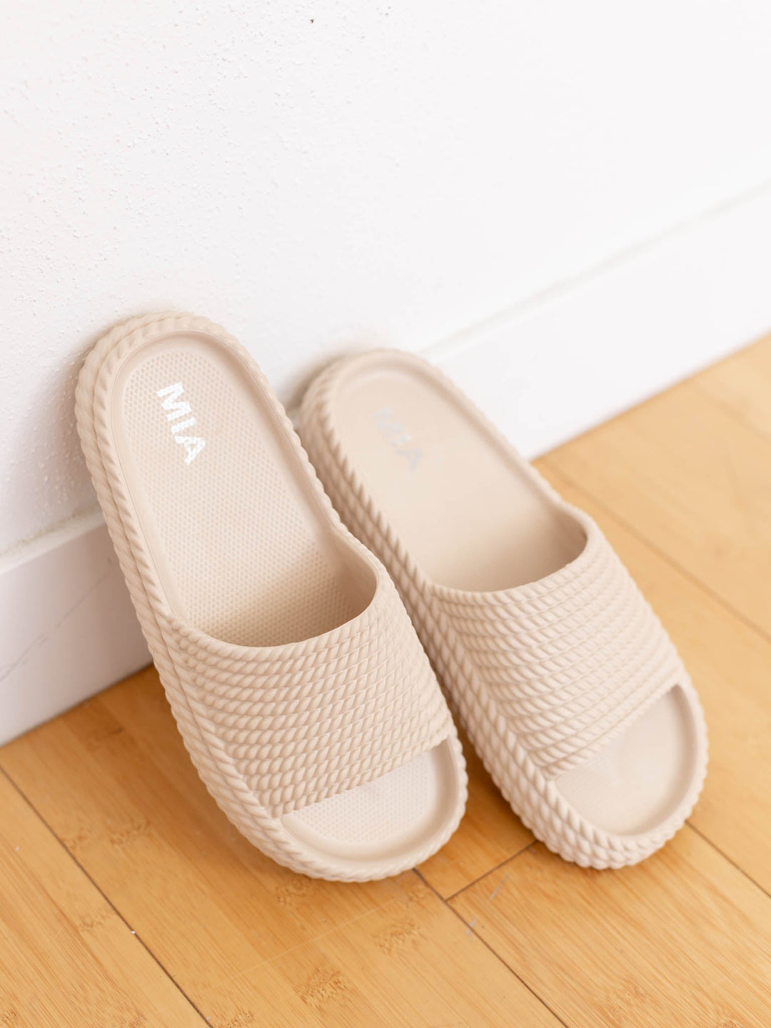 An update to our favorite pool slides of years past, we love the textured, braided inspired detail that these slip on sandals give us. A fun and comfortable style to rock all season long.