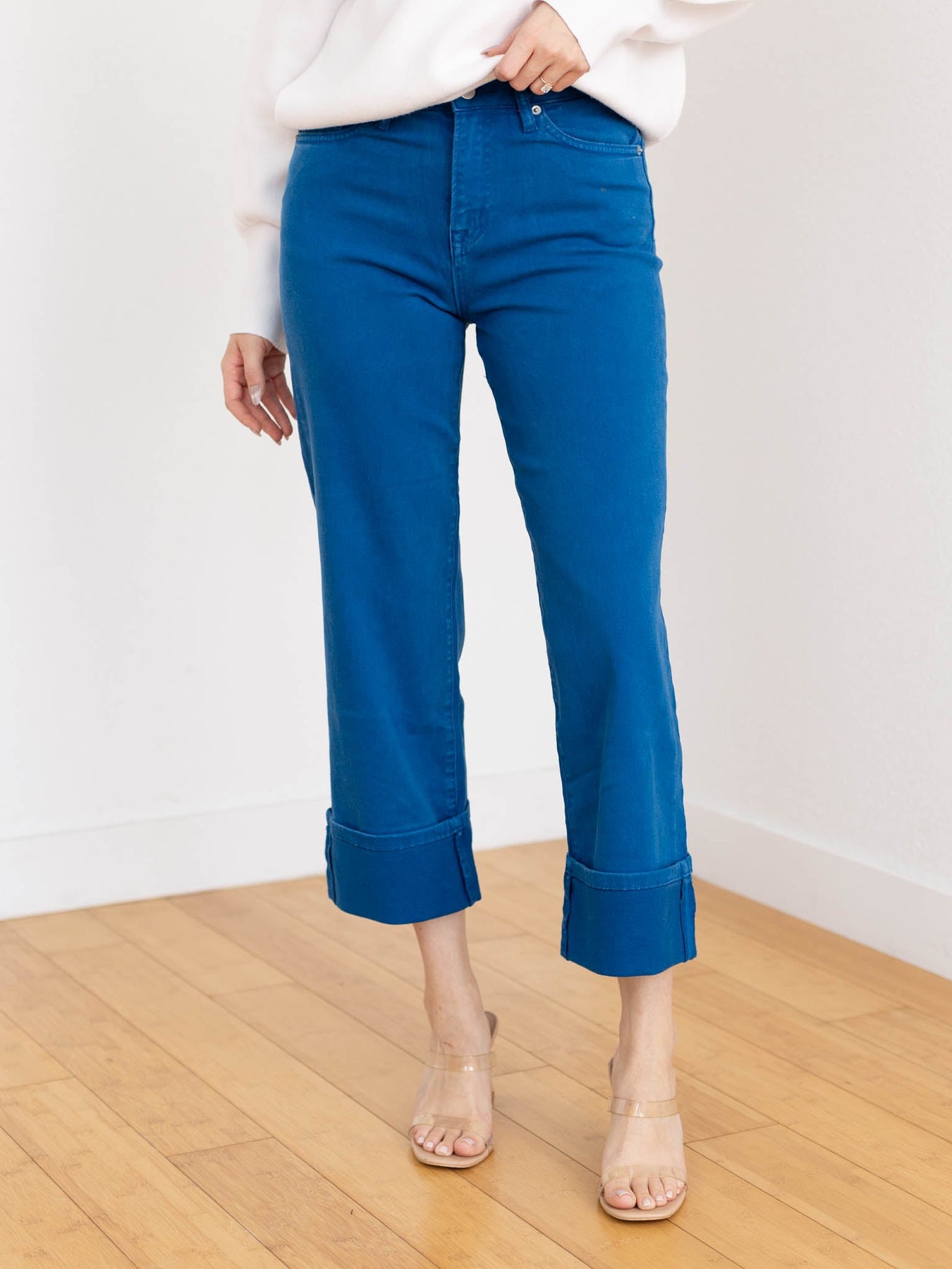 Introducing the MICA Bright Blue High Rise Crop with a wide cuff detail! This playful, high-waisted denim is sure to turn heads with its bold blue wash and cropped fit. Perfect for adding a pop of color to your wardrobe and showing off your fun side.