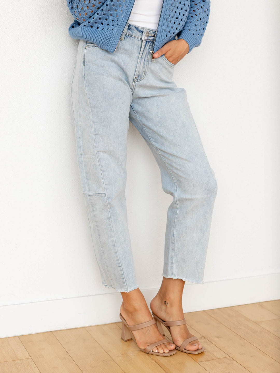 Step into effortless style with the MICA Jeans Aid Blue High Rise Barrel. Featuring a subtle barrel silhouette and unique seaming accents, these jeans bring a fresh twist to your wardrobe. The ultra-light wash adds a breezy vibe, while the ankle length and high rise create a flattering, playful look perfect for any casual outing. Your new go-to for chic comfort!
