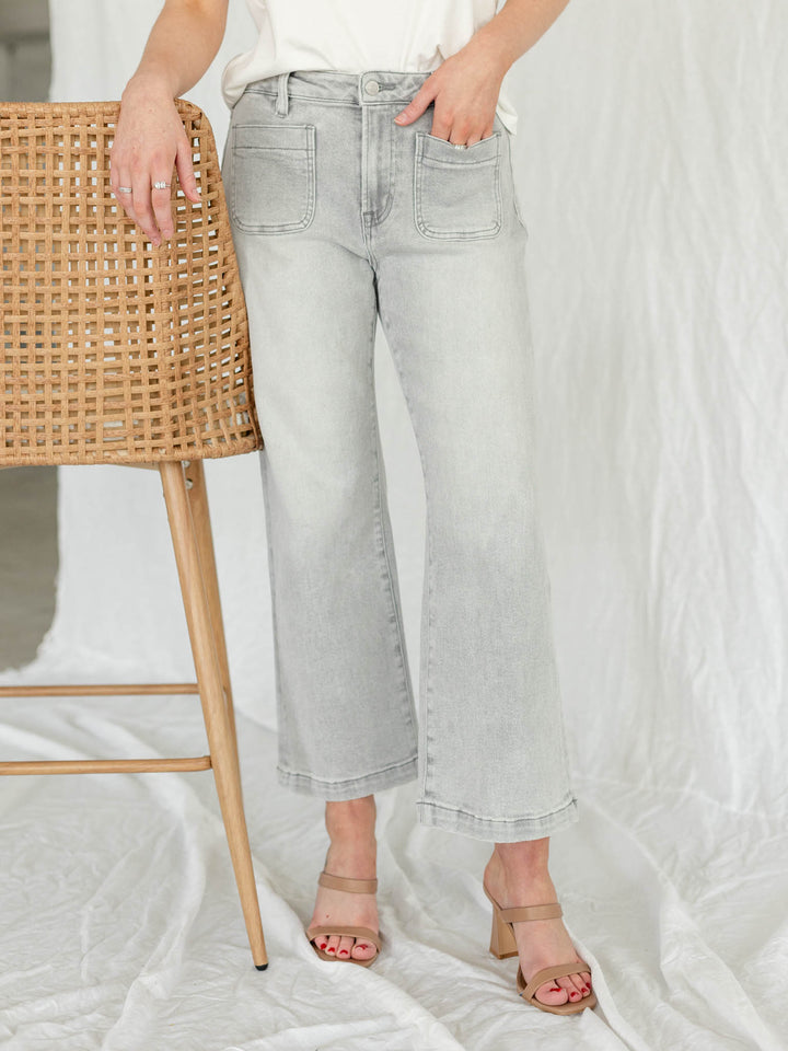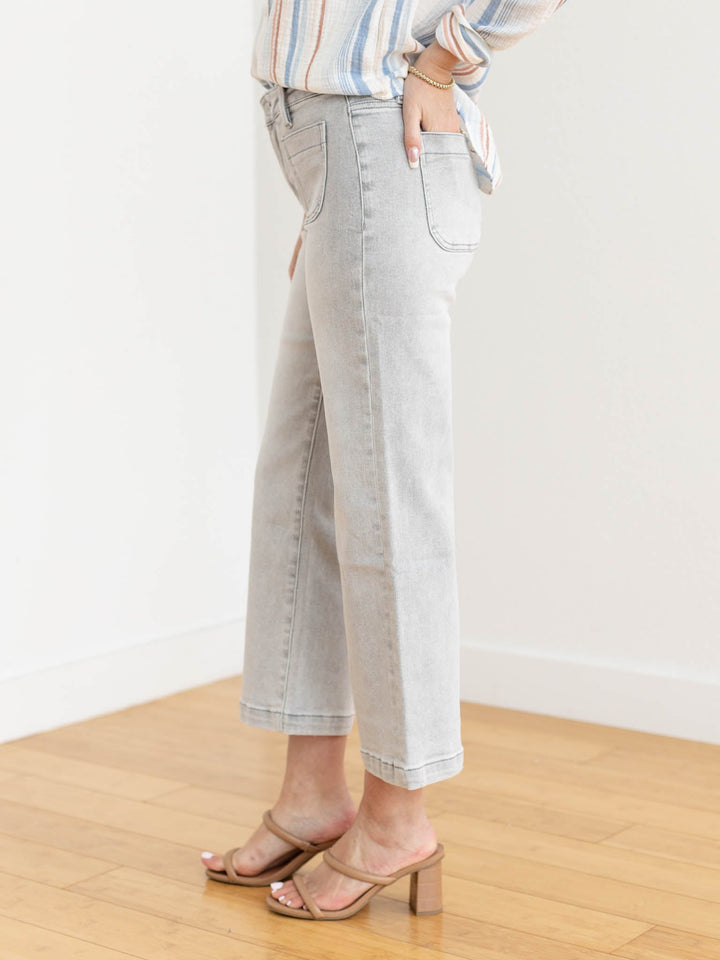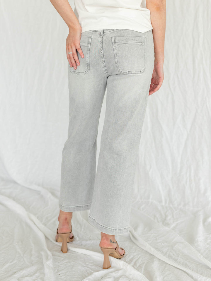 We are still loving the front patch pocket design that totally updates + elevates the denim of the season. These new arrivals from MICA feature a super light washed grey coloration to add a casual appeal to your style. A cropped wide leg silhouette allows this look to transition from season to season with ease.