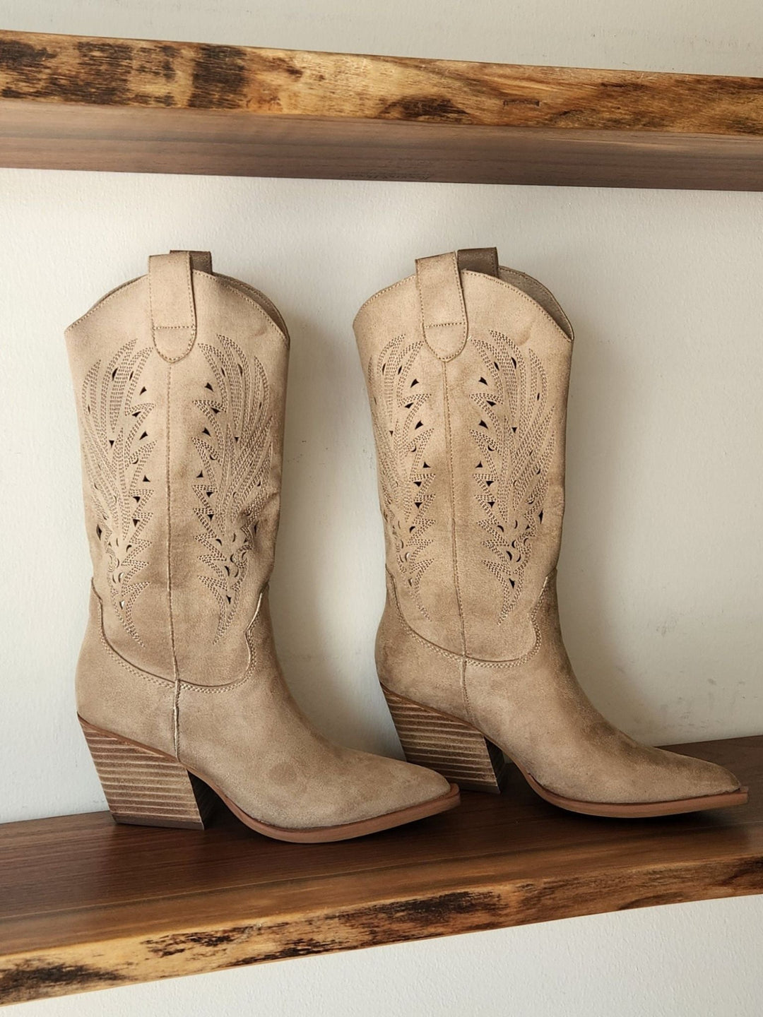 These cowboy boots features a unique cut out and embroidered western inspired design. Perfect for all of those summer festivals and concerts!